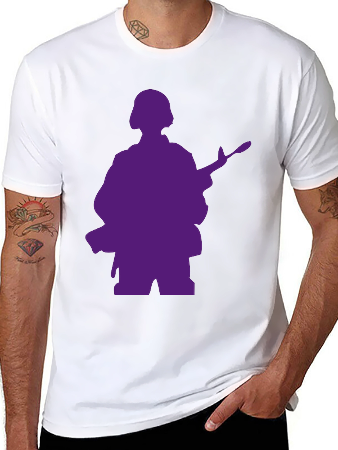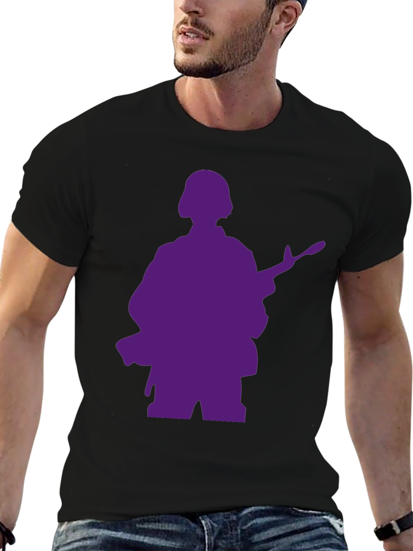 Showcase your unique style with this eye-catching black t-shirt. This modern tee features a bold purple graphic of a soldier silhouette, making it a statement piece for your wardrobe. Crafted from comfortable, breathable fabric, it is suitable for everyday wear. The classic cut and versatile design makes it a perfect match with jeans, shorts, or casual pants. Whether you're running errands or hanging out with friends, this t-shirt will set you apart from the crowd.