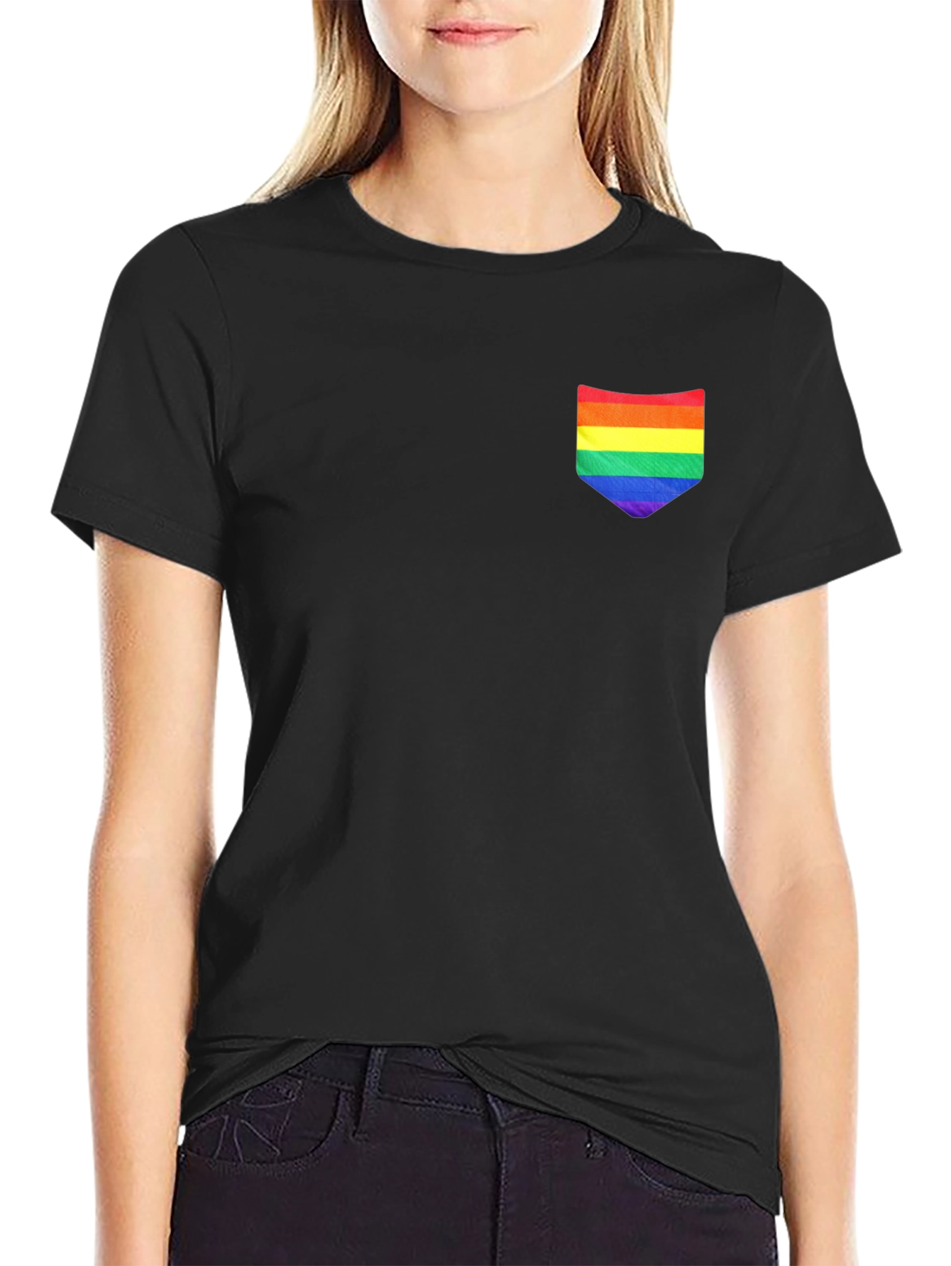 Show your pride with this stylish black t-shirt featuring a vibrant rainbow pocket! Made from soft, breathable fabric, this tee offers both comfort and a bold statement. The eye-catching rainbow pocket adds a pop of color and personality to any outfit. Perfect for casual wear, pride events, or as a thoughtful gift. Stand out and celebrate diversity with this unique and comfortable tee.
