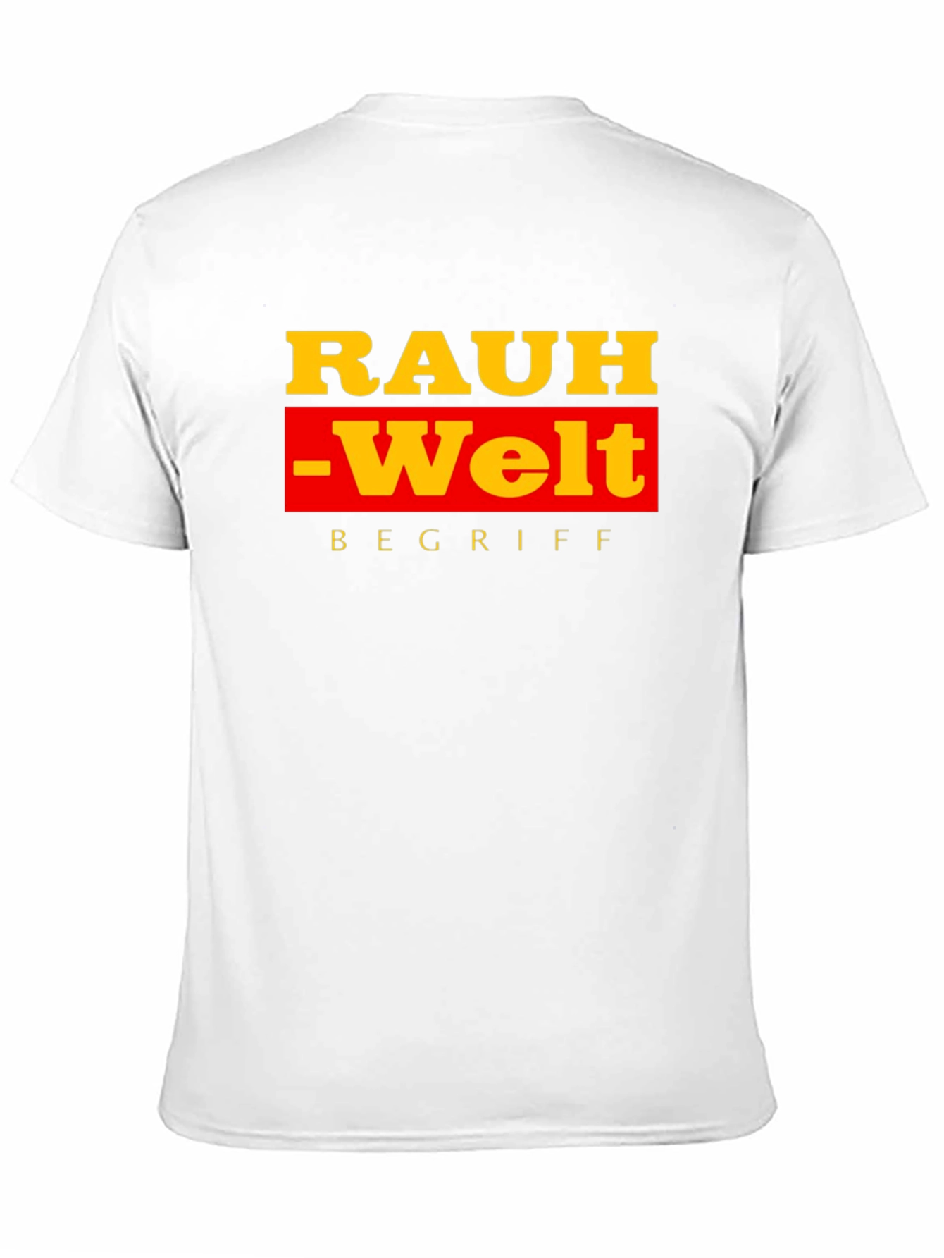 Showcase your appreciation for Rauh-Welt Begriff with this stylish black t-shirt. The design features the iconic "RAUH -Welt" logo in striking yellow and red, complemented by the word "BEGRIFF" in yellow at the bottom. Crafted from soft, breathable fabric, this tee offers both comfort and durability for everyday wear. Perfect for casual outings, car meets, or simply expressing your love for automotive culture. Make a bold statement with this unique tee.