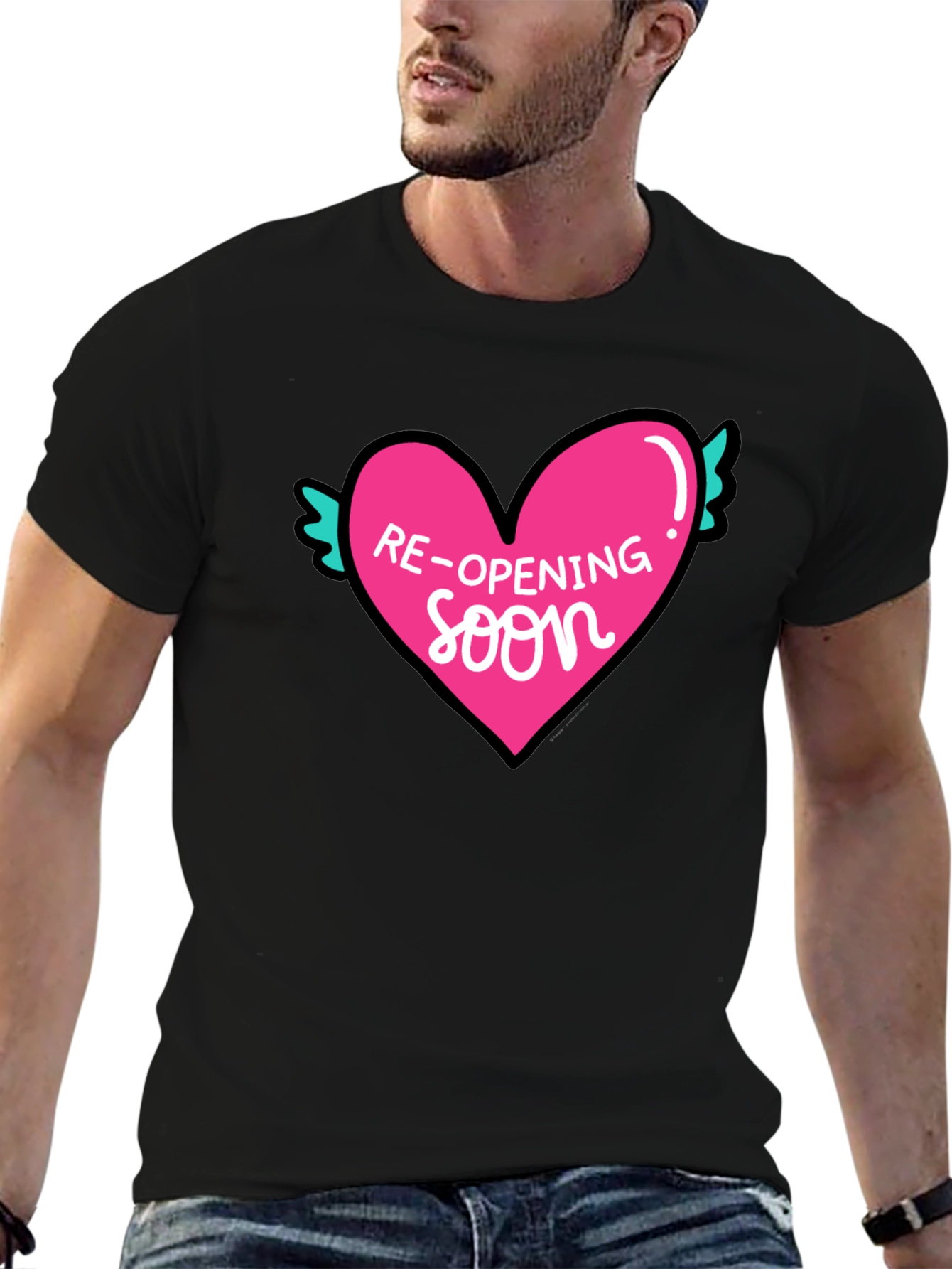 Spread positivity with this stylish black graphic tee! This eye-catching shirt features a vibrant pink heart design with the words "Re-Opening Soon." The heart is adorned with playful teal wings, adding a touch of whimsy. Made from a comfortable, breathable fabric, this tee is perfect for everyday wear. Show your support for local businesses and spread excitement for re-opening with this trendy and optimistic shirt. Ideal for casual outings, community events, or simply relaxing at home, this tee is a great way to make a statement and share a positive message. Get yours today and be ready for what's next!