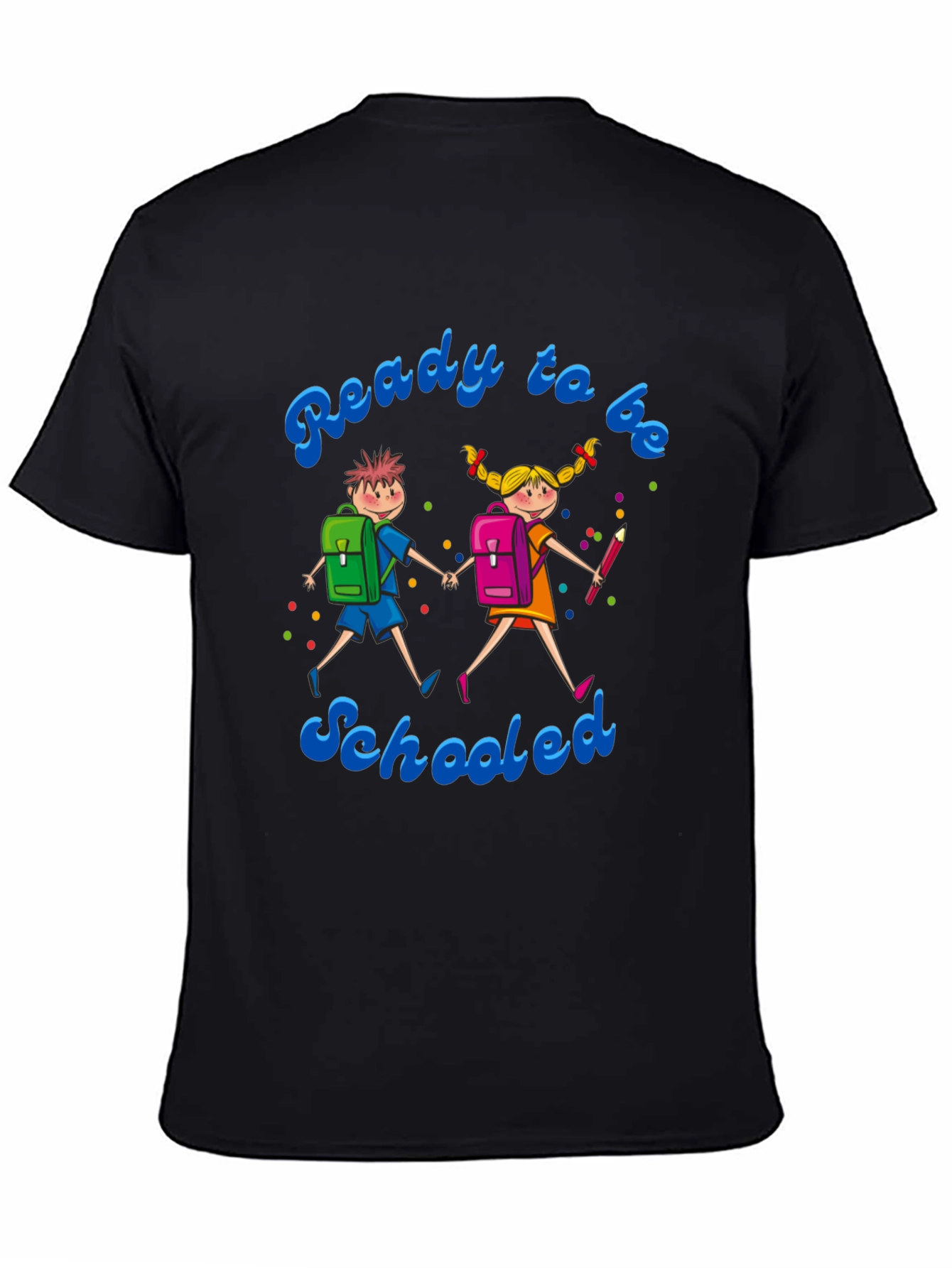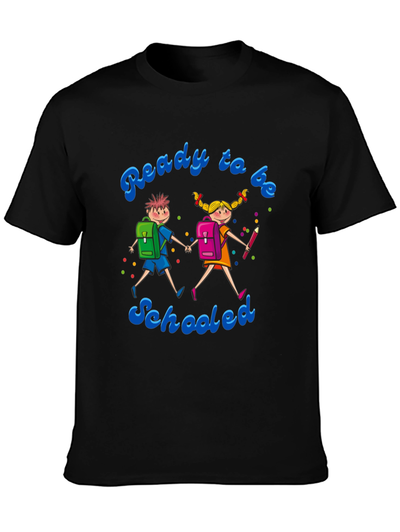 Get ready for school with this fun and vibrant graphic t-shirt! The design features a cheerful illustration of two kids heading to school, complete with backpacks, colorful details, and the playful phrase "Ready to be Schooled". The shirt is made from a soft, comfortable fabric perfect for everyday wear. It's an ideal choice for students, teachers, or anyone who loves a touch of whimsy in their wardrobe. Show off your back-to-school spirit or gift it to your favorite student! This tee is sure to bring a smile and add a pop of color to any outfit.
