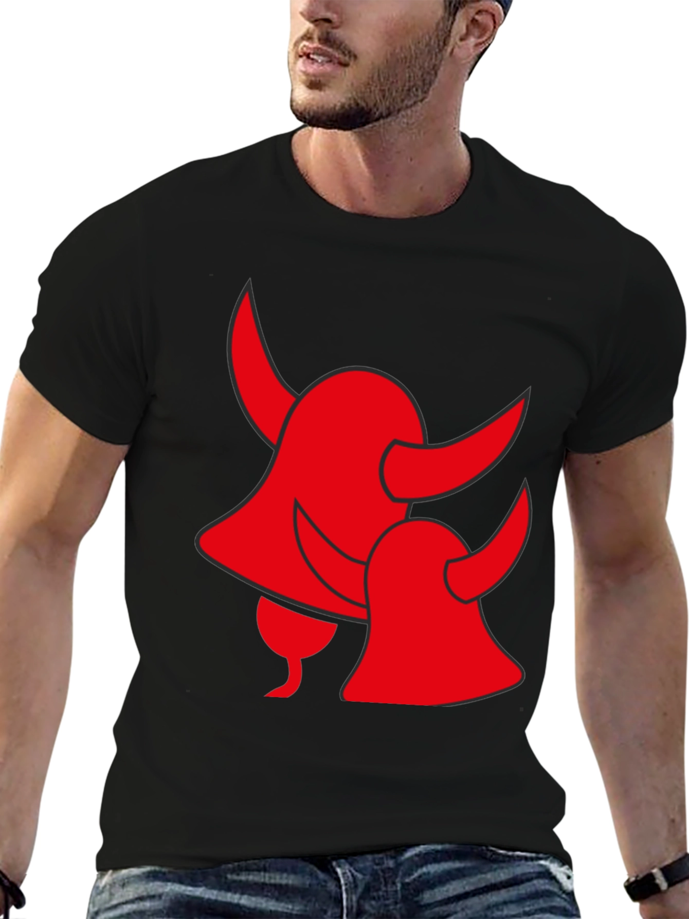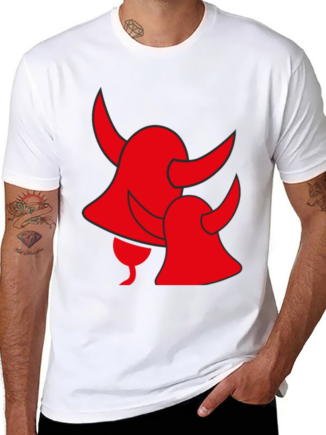 Show off your devilish side with this eye-catching black t-shirt. The shirt features a bold red graphic of two devil horns. Made from soft, breathable fabric, this shirt is comfortable enough for all-day wear and sure to turn heads. It's the perfect choice for casual outings, parties, or just lounging around the house. Dress it up with jeans or wear it with your favorite lounge pants for an edgy, relaxed look. A must-have for anyone with a bold sense of style.