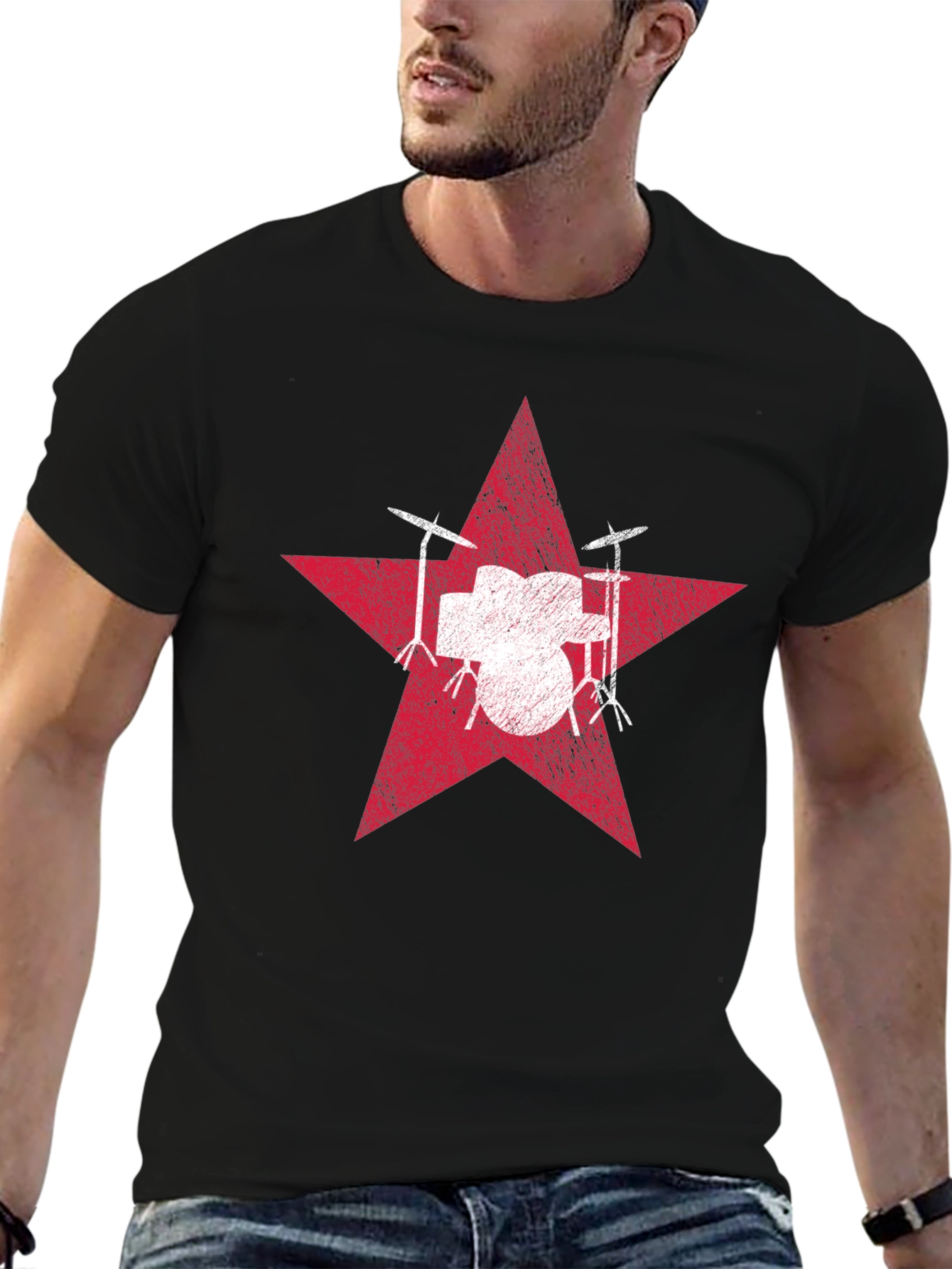 Rock your style with this eye-catching black t-shirt. The tee features a bold graphic design of a white drum set superimposed on a red starburst. The design has a distressed or vintage look, adding to its unique charm. Crafted from a comfortable fabric blend, this shirt is perfect for everyday wear. Whether you're a musician, music lover, or simply appreciate cool graphics, this tee is a must-have addition to your wardrobe. Dress it up with jeans and sneakers for a casual yet stylish look.