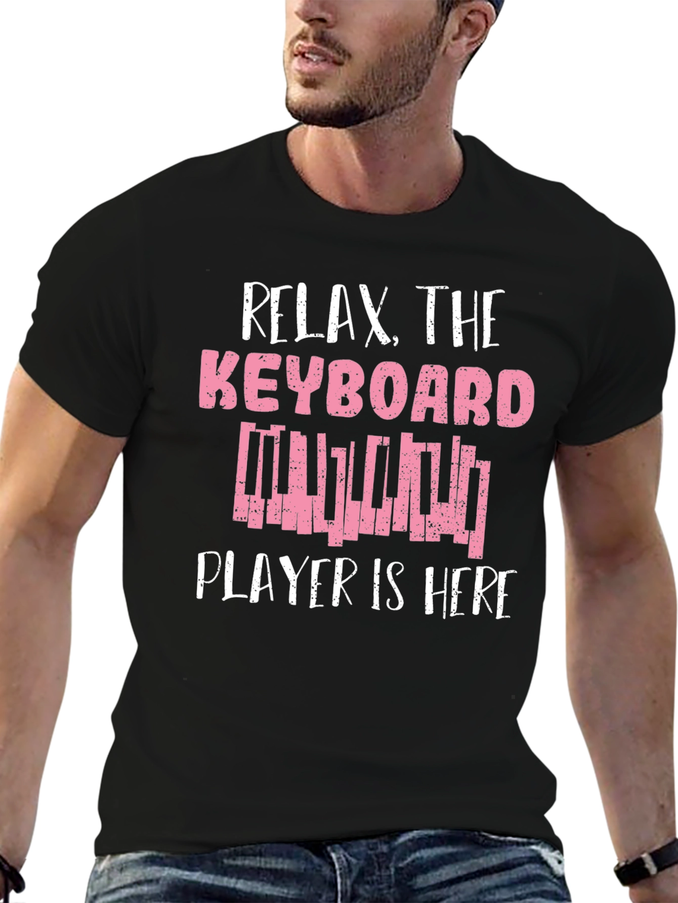 This black t-shirt features a playful design perfect for music lovers. The design says “Relax, The Keyboard Player Is Here” in a fun font and pink color. Ideal for casual wear, music teachers, and keyboard enthusiasts, this shirt is sure to bring a smile to those around you. Show off your passion for music with this comfortable and stylish tee.
