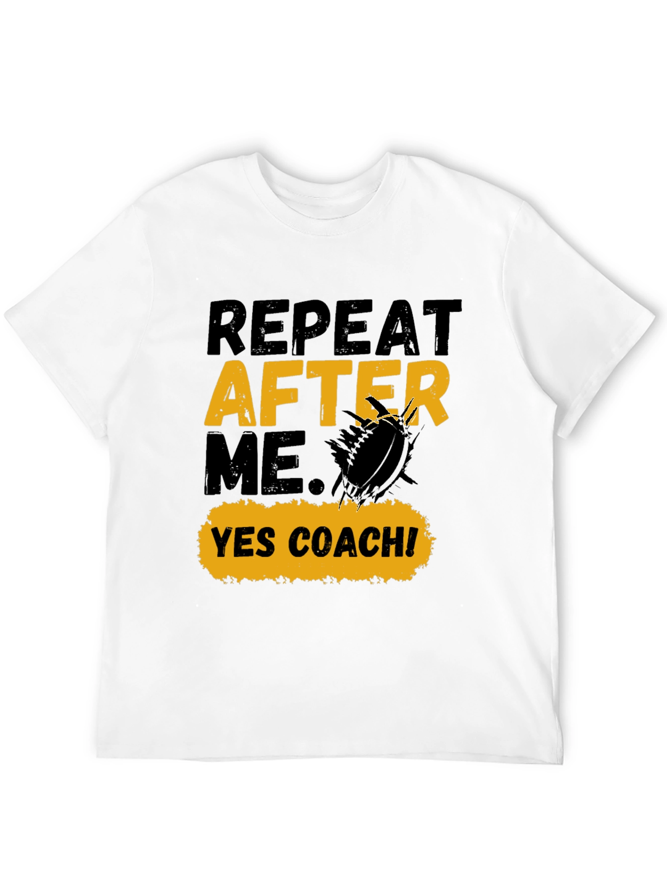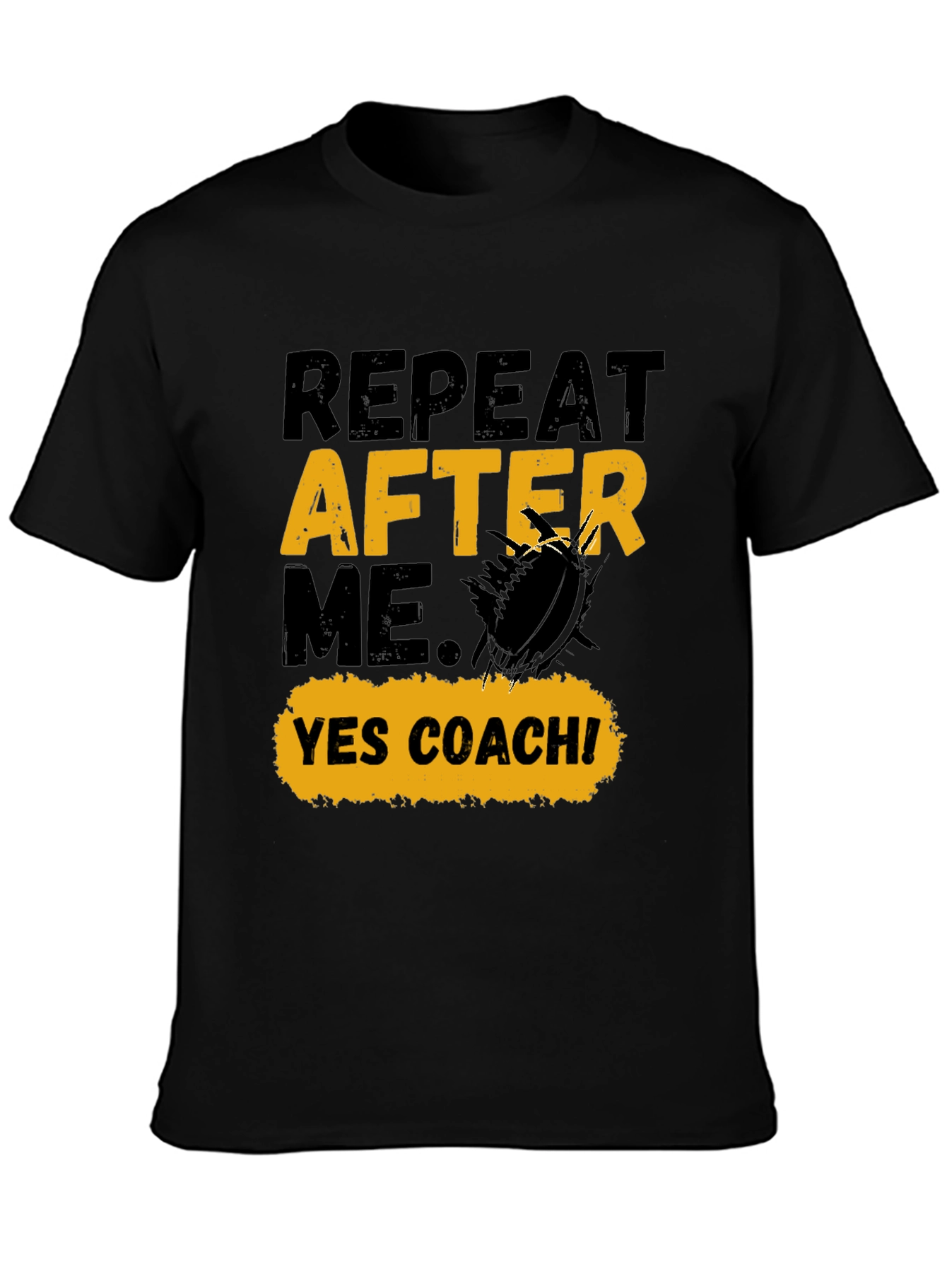 Show your coach some love with this awesome t-shirt. This black tee features the phrase "Repeat After Me. Yes Coach!" in a bold, eye-catching graphic. The design incorporates sporty elements making it a perfect gift for athletes and coaches alike. Made from comfortable materials, this t-shirt is ideal for workouts, practices, or casual wear. Express your appreciation and team spirit with this unique piece!
