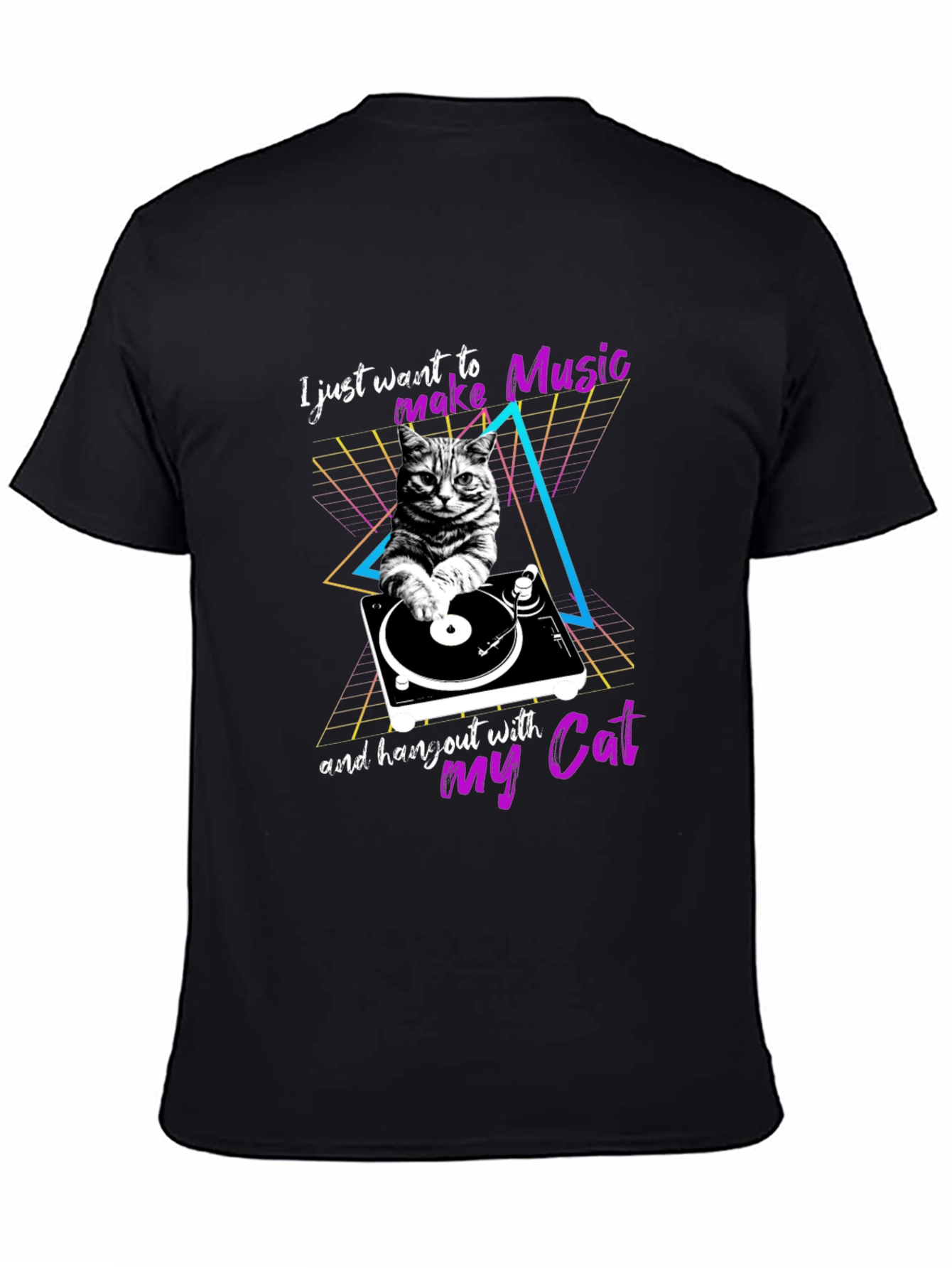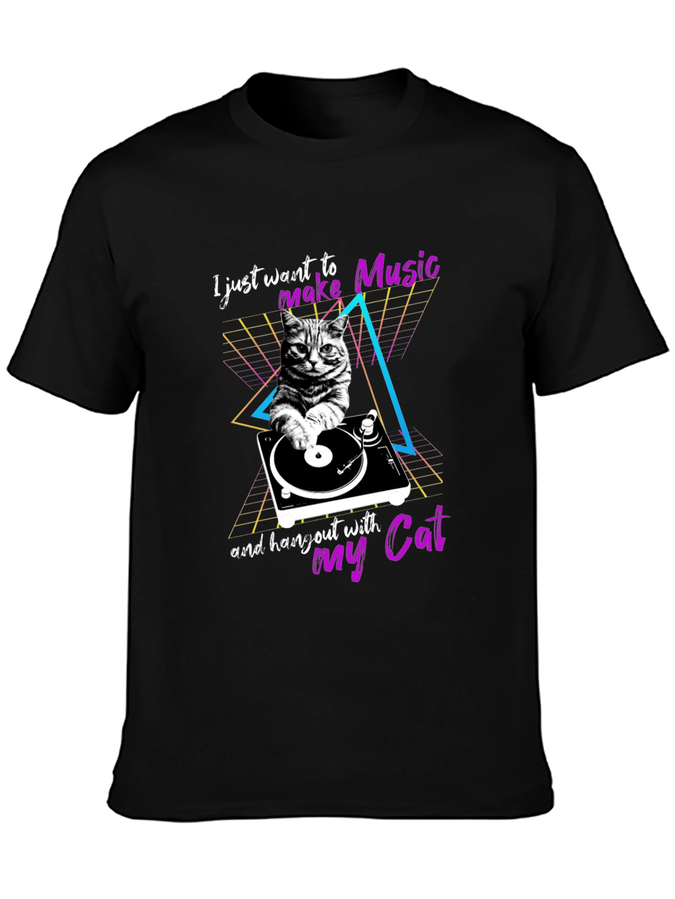 Rock your style with this unique black t-shirt featuring a cool cat DJ design! The tee showcases a retro aesthetic, complete with neon-style triangles and the humorous saying "I just want to make music and hang out with my cat." Made from comfortable-looking fabric, this shirt is perfect for music enthusiasts, cat lovers, or anyone who enjoys a fun and quirky graphic tee. Wear it casually with jeans, shorts, or dress it up with a blazer for a night out. Guaranteed to be a conversation starter wherever you go, this tee lets you express your passions with a touch of vintage flair. Perfect gift idea!