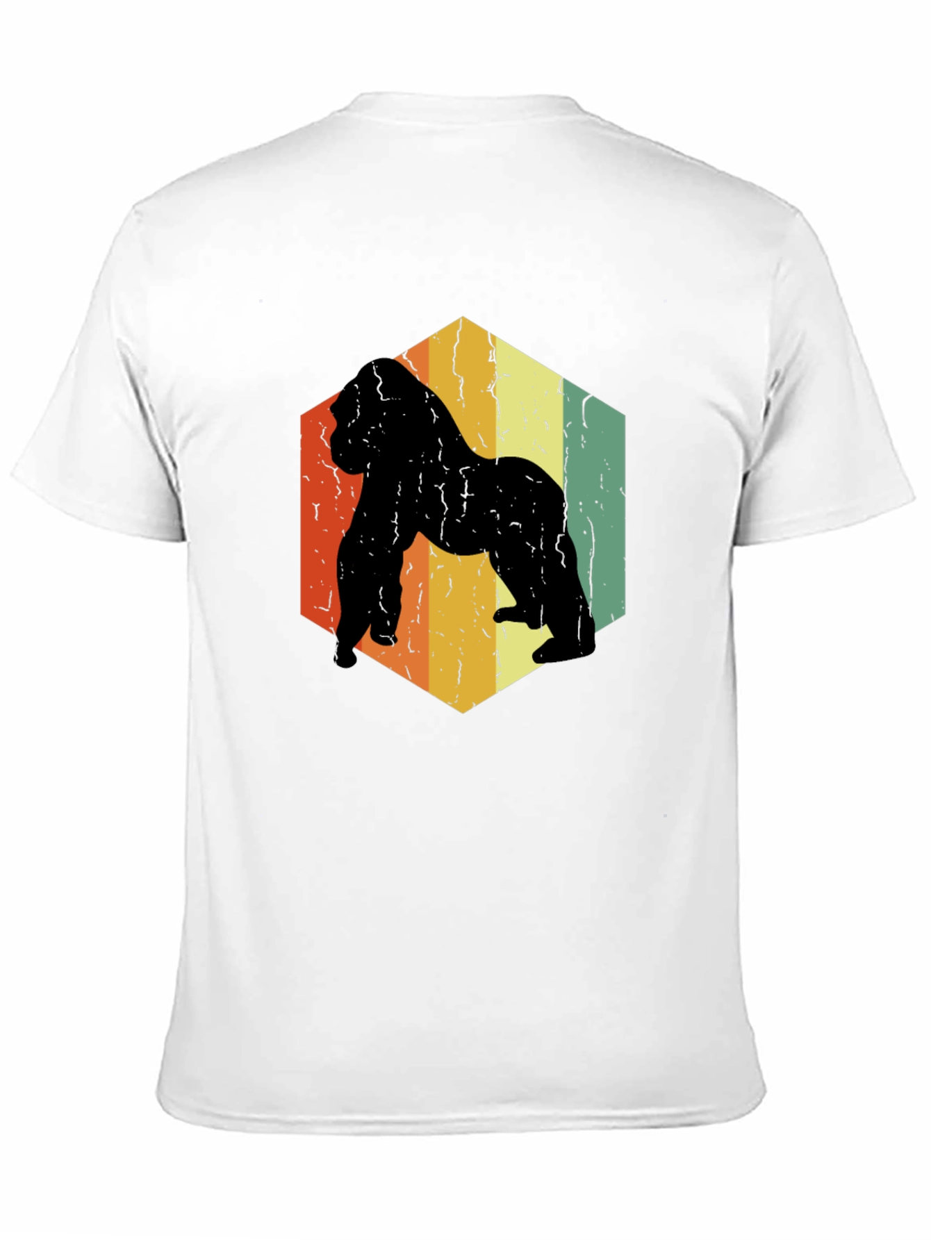 Show off your wild side with this stylish black t-shirt featuring a retro gorilla graphic. The design boasts a striking gorilla silhouette inside a vintage-inspired hexagon with red, yellow, and green stripes. Crafted from comfortable, breathable fabric, this tee is perfect for everyday wear. Its unique design makes it a great conversation starter and a cool addition to any casual wardrobe. Wear it with jeans, shorts, or your favorite casual pants for a relaxed and stylish look. Perfect for animal lovers and those who appreciate a vintage aesthetic. Order yours today!