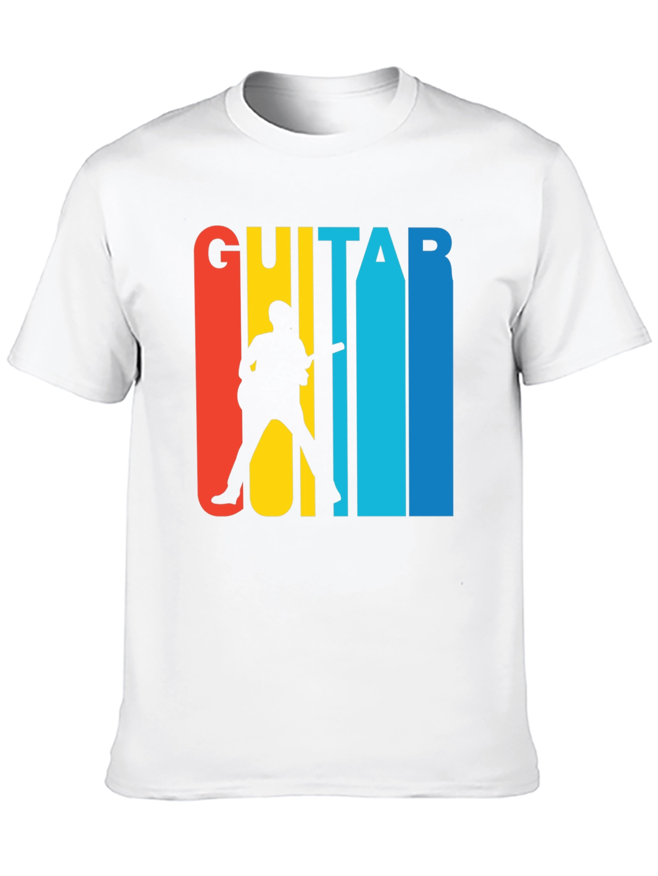 Show off your love for music with this stylish black t-shirt. The tee features a retro-inspired design with the word 'GUITAR' rendered in bold, vertical stripes of red, yellow, light blue, and dark blue. A silhouette of a guitar player is centered in the design, adding a cool, musical vibe. Made from soft, breathable cotton, this t-shirt offers both comfort and style. Perfect for casual wear, concerts, or as a gift for music enthusiasts. Grab yours today and rock the retro look!