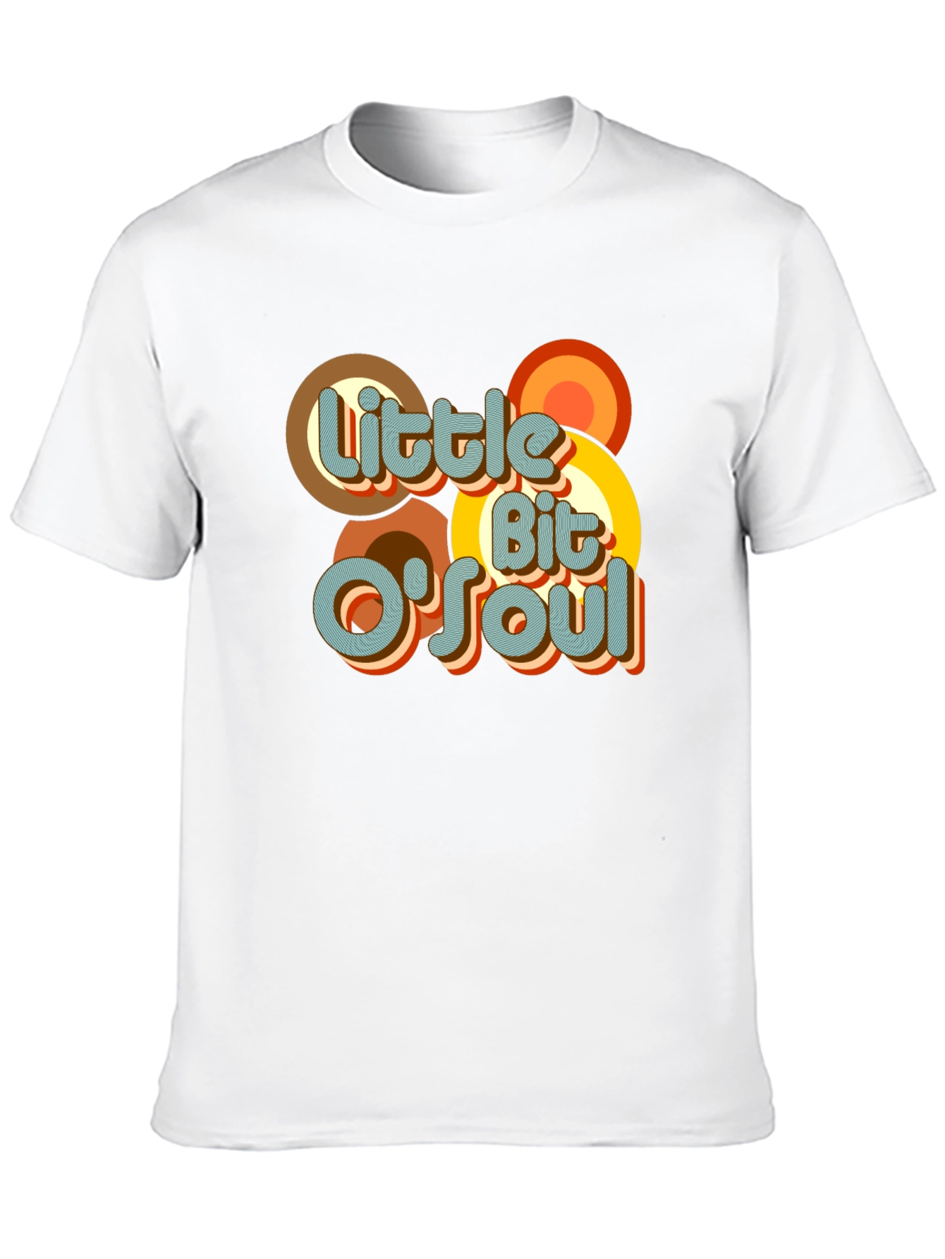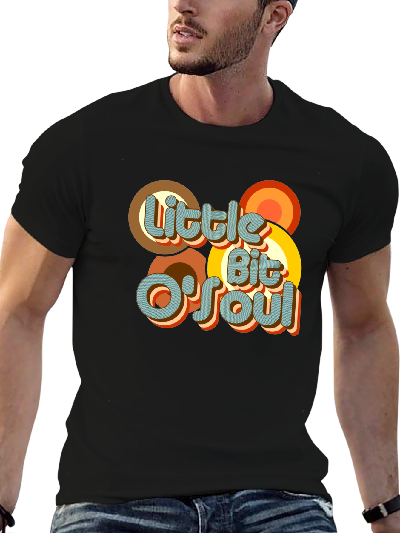 Show off your soulful style with this eye-catching retro graphic t-shirt! This classic black tee features a vibrant "Little Bit O' Soul" design, complete with groovy, concentric circle accents in warm hues of orange, yellow, and brown. The design offers a nostalgic nod to the 70s, making it a perfect conversation starter. Made from a comfortable, breathable fabric, this shirt is ideal for casual wear, concerts, or expressing your love for vintage aesthetics. Pair it with jeans or shorts for a relaxed, cool look. Add a touch of soulful retro charm to your wardrobe today!