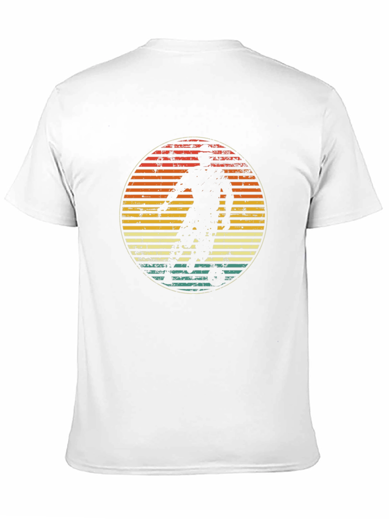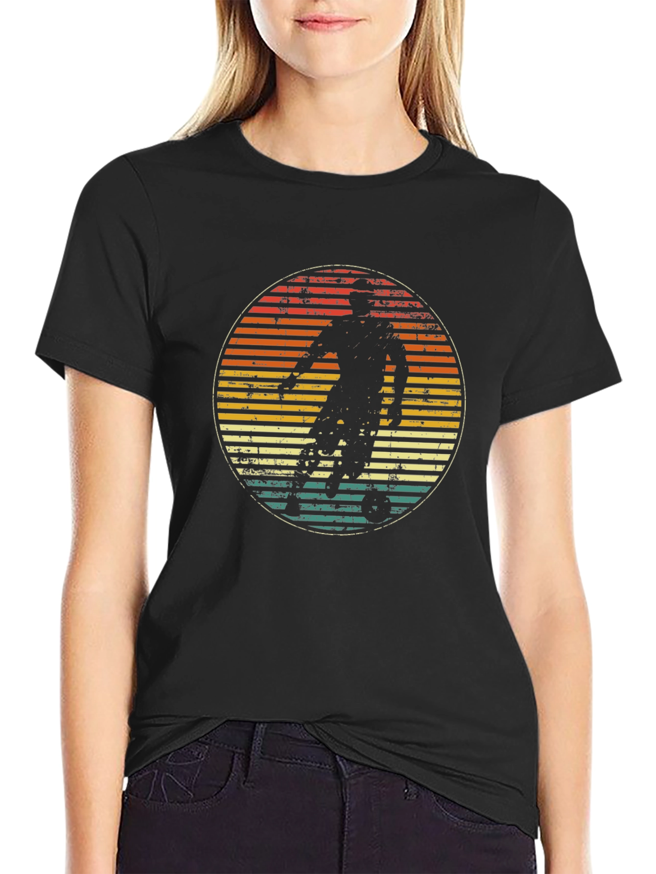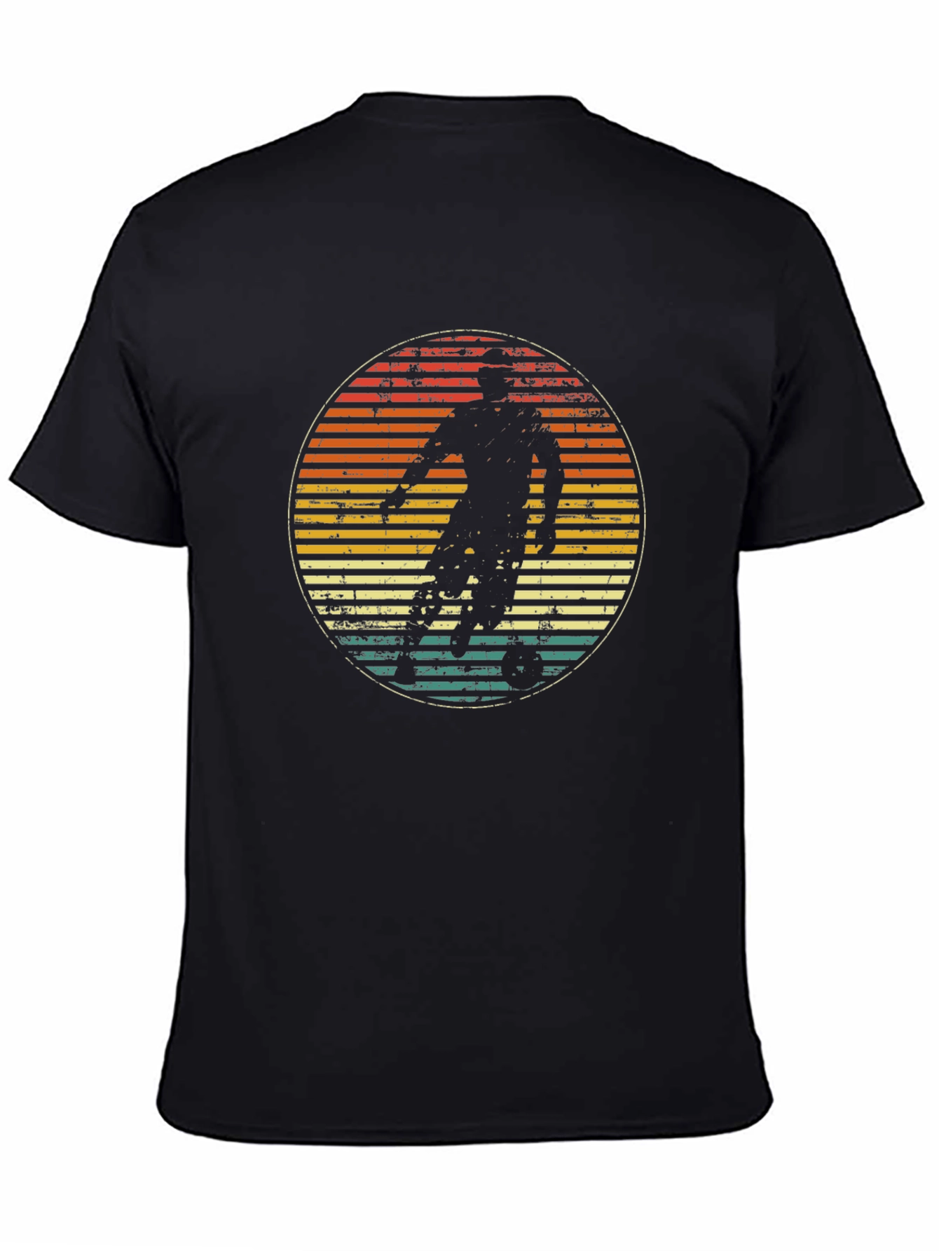 Score a style goal with this vintage-inspired soccer tee! This black t-shirt features a retro-style graphic of a soccer player in action, set against a distressed, striped circle background with shades of orange, yellow, and teal. Made from what appears to be a comfortable, breathable cotton blend, this short-sleeve shirt offers a classic fit for everyday wear. Perfect for soccer fans and vintage enthusiasts alike, it's a cool and casual way to show off your love for the beautiful game. Pair it with jeans or shorts for a laid-back look that's sure to turn heads both on and off the field.
