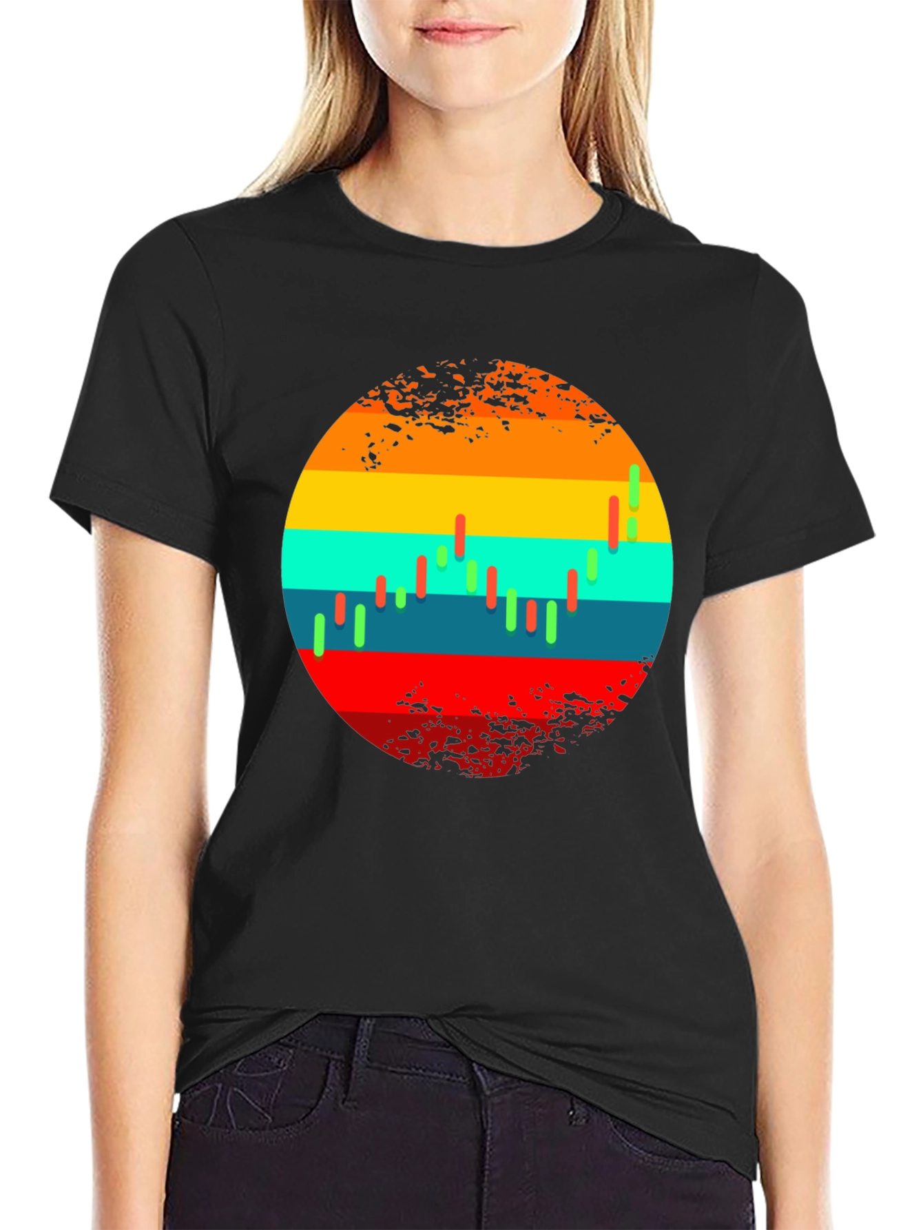 Show off your financial savvy with this eye-catching t-shirt! Featuring a vintage-inspired design, this black tee displays a colorful stock market chart within a distressed circle graphic. The vibrant bars of orange, yellow, teal, and red create a retro sunset effect, making it a standout piece in any wardrobe. Made from comfortable, breathable fabric, this t-shirt is perfect for casual wear, trading meetups, or as a conversation starter about investments. Express your passion for the stock market with style and comfort. Get yours today and make a statement!
