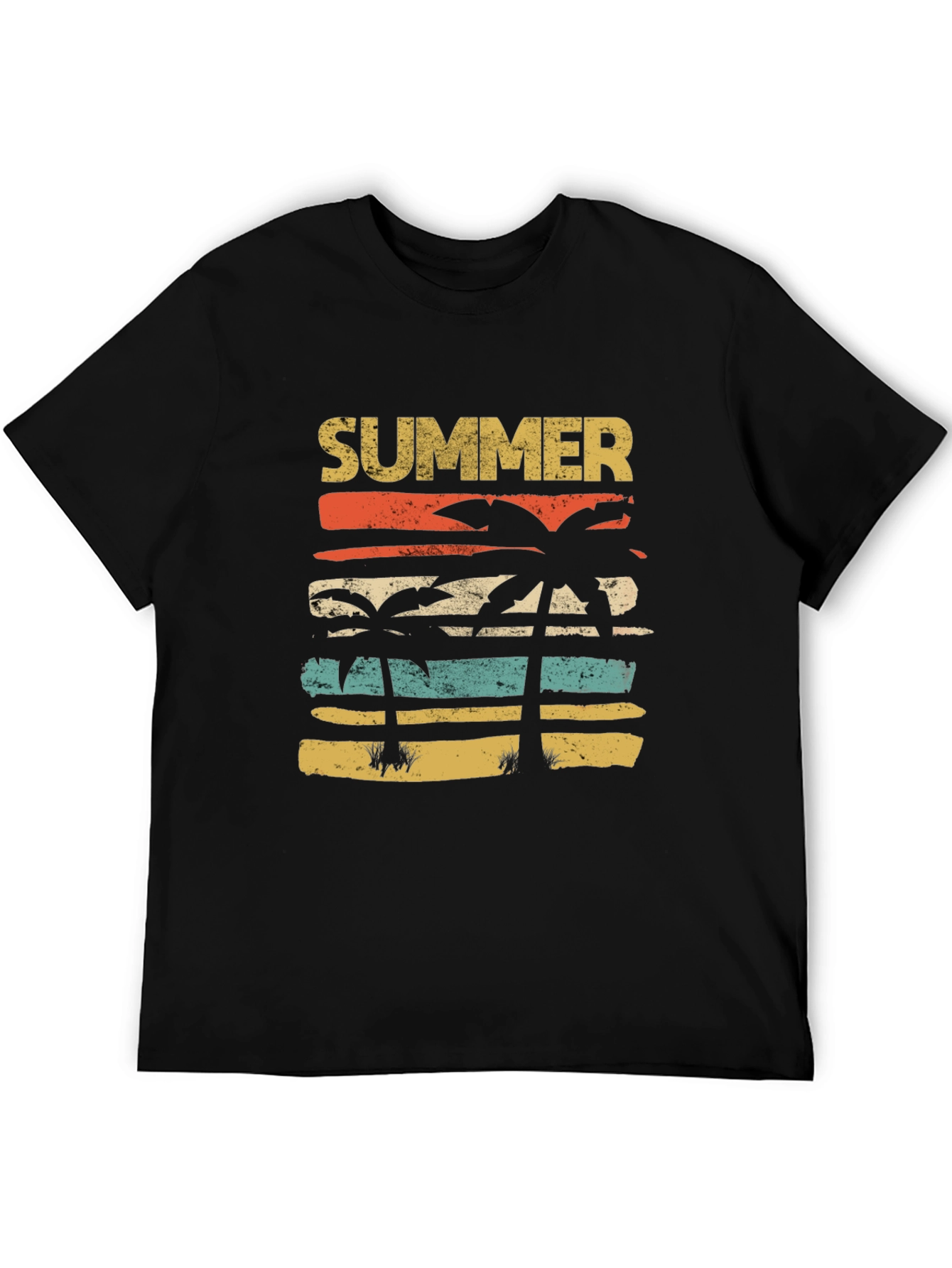 Embrace the summer vibes with this retro-inspired graphic tee. The black t-shirt features a colorful design with the word 'SUMMER' printed above a stylized sunset and palm trees. The design incorporates a vintage aesthetic with slightly distressed, horizontal stripes in orange, turquoise, and beige. Made from what appears to be a soft and breathable cotton blend, this shirt is perfect for casual wear, beach outings, or relaxed vacations. Stand out with its eye-catching print that evokes a sense of adventure and summer fun. Pair it with shorts, jeans, or your favorite summer outfit for a cool, carefree look.