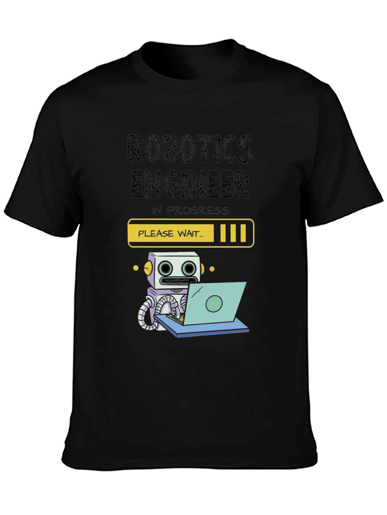Show off your passion for robotics with this unique "Robotics Engineer In Progress" t-shirt! This eye-catching black tee features a playful design of a robot working on a laptop, complete with a "Please Wait..." loading bar. The clever graphic appeals to anyone in the engineering or tech field with a sense of humor. Made from a comfortable and durable fabric, this shirt is perfect for casual wear, tech conferences, or as a fun gift for the robot enthusiast in your life. Gear up and display your techy side with this must-have t-shirt!
