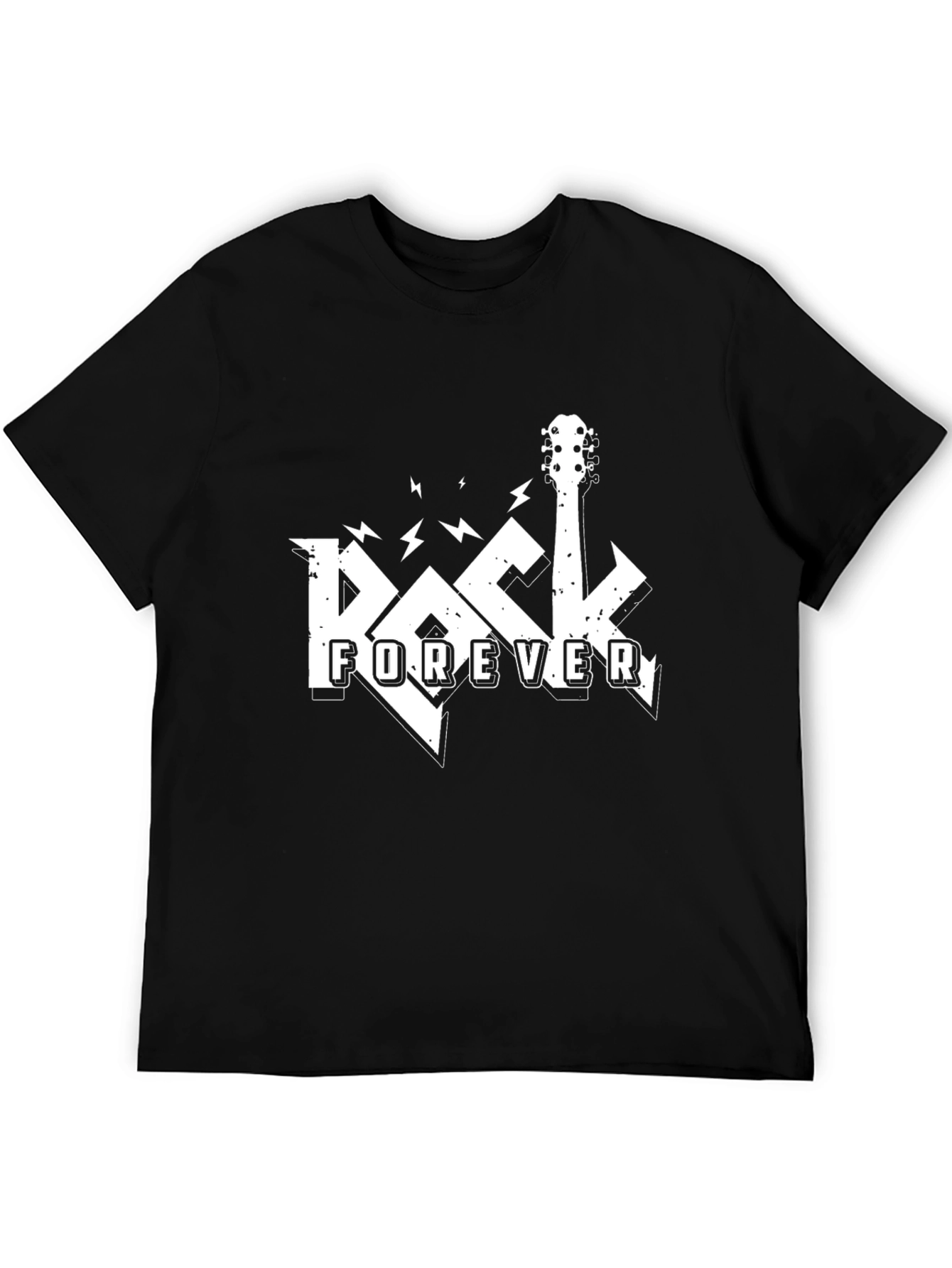 Show your love for rock music with this striking black graphic t-shirt. The bold white design features the words "Rock Forever" in a stylized font, accompanied by a guitar neck graphic and lightning bolts, making a statement. Made from what appears to be a soft and comfortable cotton blend, this tee offers both style and comfort. This t-shirt is perfect for everyday wear, concerts, or casual outings. The classic fit makes it easy to pair with jeans, shorts, or even a jacket for a cool, relaxed look. Whether you're a musician or simply a rock enthusiast, this shirt is a must-have for your wardrobe.