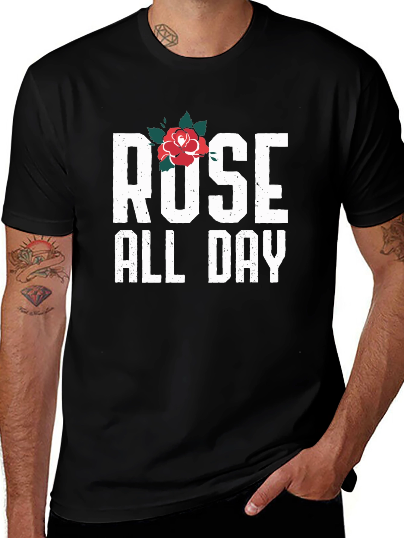 This black, short-sleeved t-shirt features a bold, distressed white print that reads 'ROSE ALL DAY'. A vibrant red rose with green leaves replaces the 'O' in 'ROSE', adding a touch of color and floral charm. The classic crew neck design and comfortable fit make it perfect for casual wear. This tee is ideal for rose lovers, wine enthusiasts, or anyone who enjoys a relaxed, stylish look. Wear it to brunch, casual outings, or simply lounging at home. It's a fun and expressive way to showcase your personal style and love for all things rose!