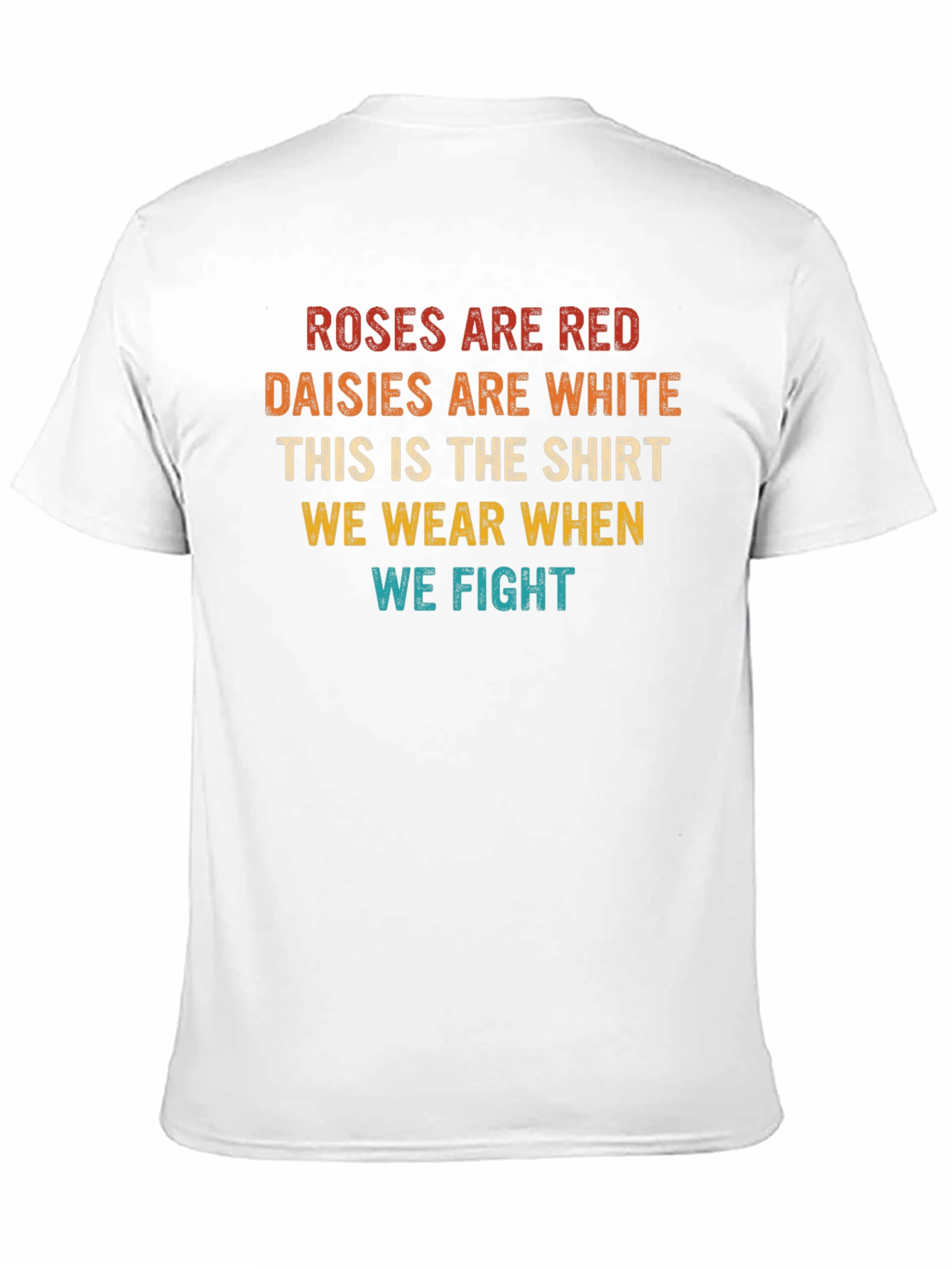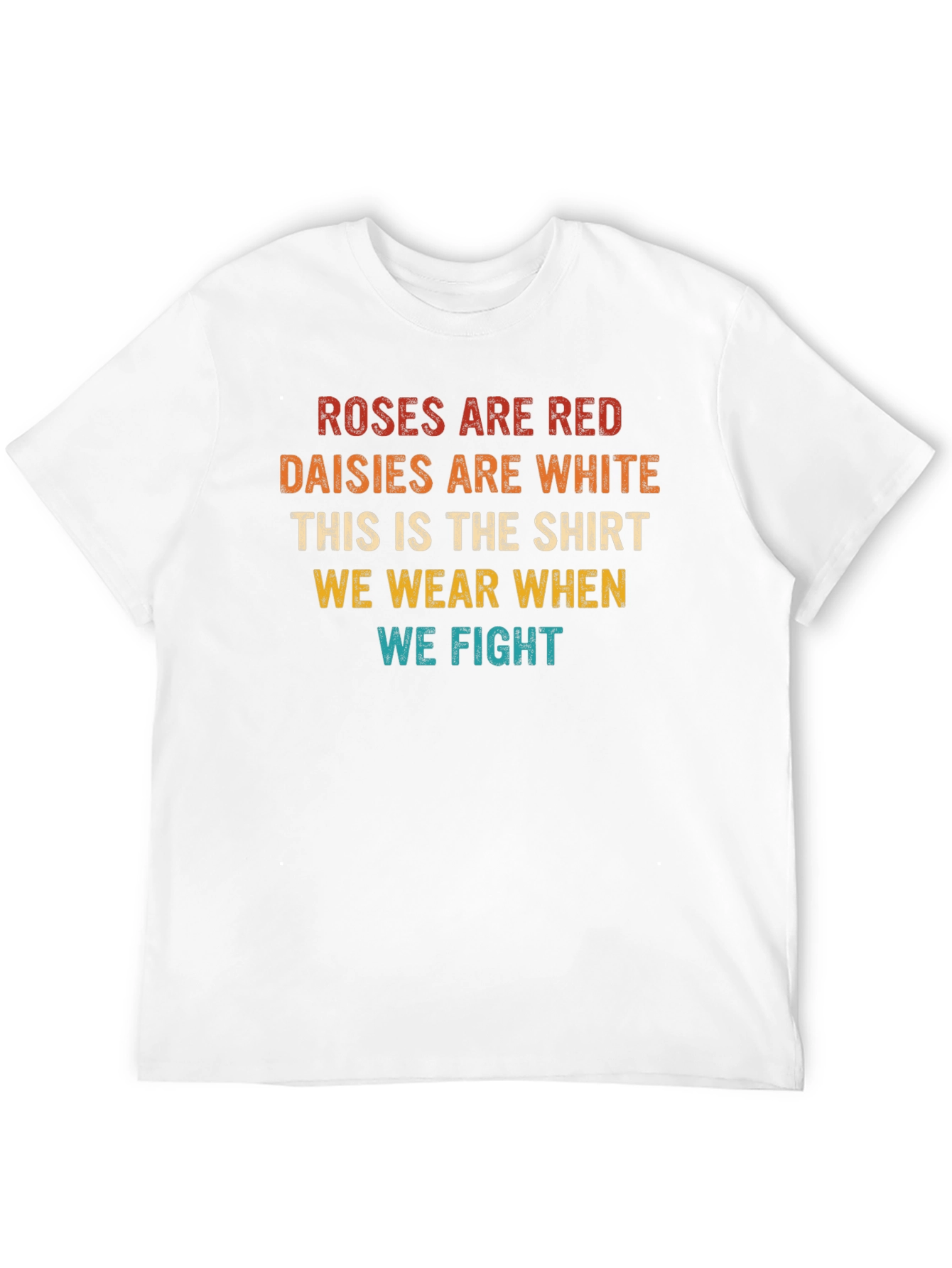 This classic fit tee features a witty statement, perfect for those with a sense of humor. "Roses are red, Daisies are white, This is the shirt we wear when we fight" is printed in a vintage-inspired color scheme. Made from soft, breathable fabric, this t-shirt offers all-day comfort. Its casual design makes it suitable for various occasions, from lounging at home to casual outings with friends. Wear it to parties, family gatherings, or simply when you want to express your unique personality with a touch of sarcasm. A great conversation starter!