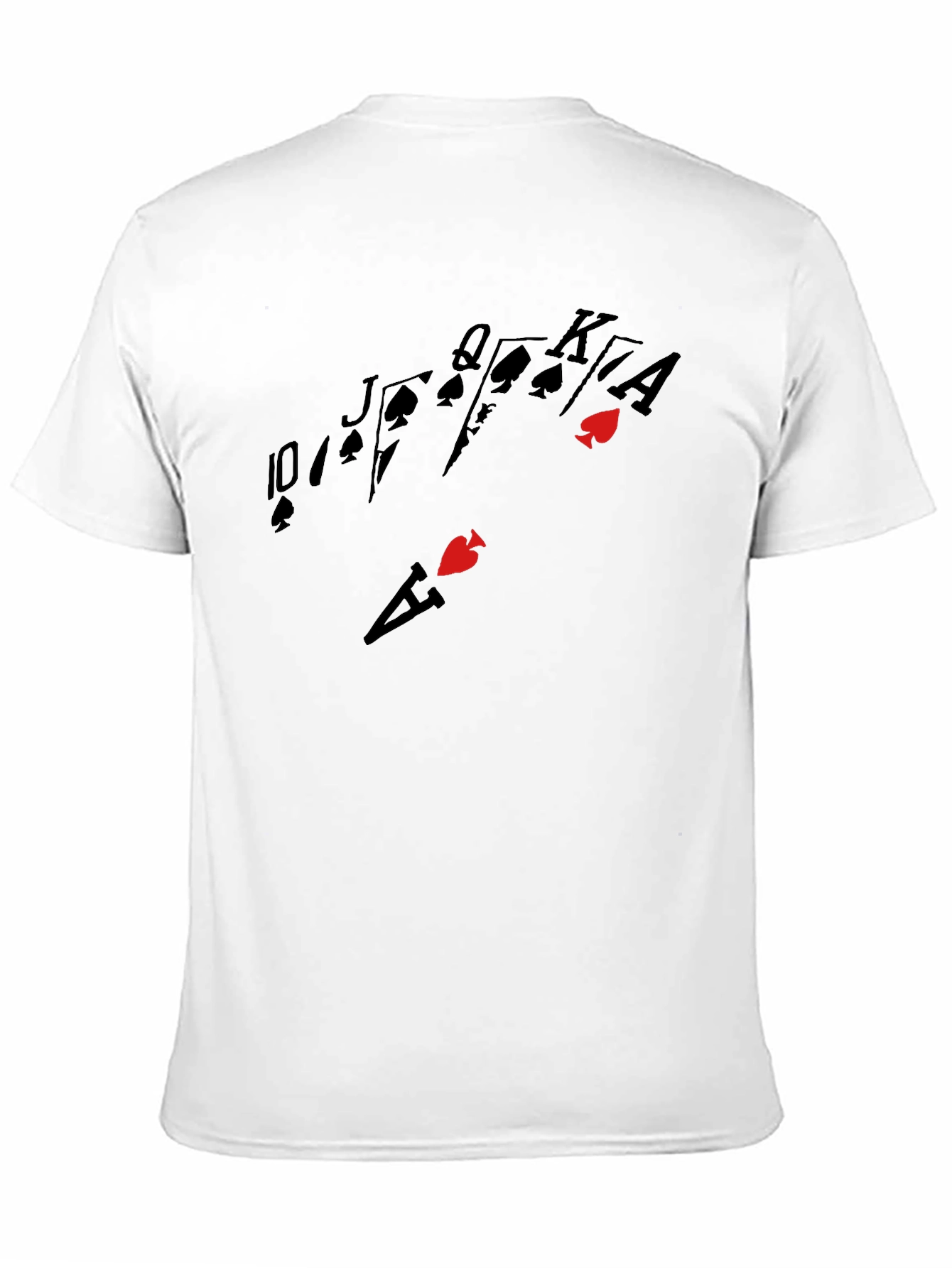 Show your love for poker with this stylish black t-shirt! This striking tee features a bold graphic of a royal flush, with spade card symbols accented by one heart suit design. Made from what appears to be soft and comfortable fabric, it's perfect for a casual day out or a night at the casino. The classic crew neck and short sleeves make it a versatile addition to any wardrobe. Whether you're a seasoned player or just a fan of the game, this shirt is sure to make a statement. Get yours today and let the world know you're always ready to go all in!