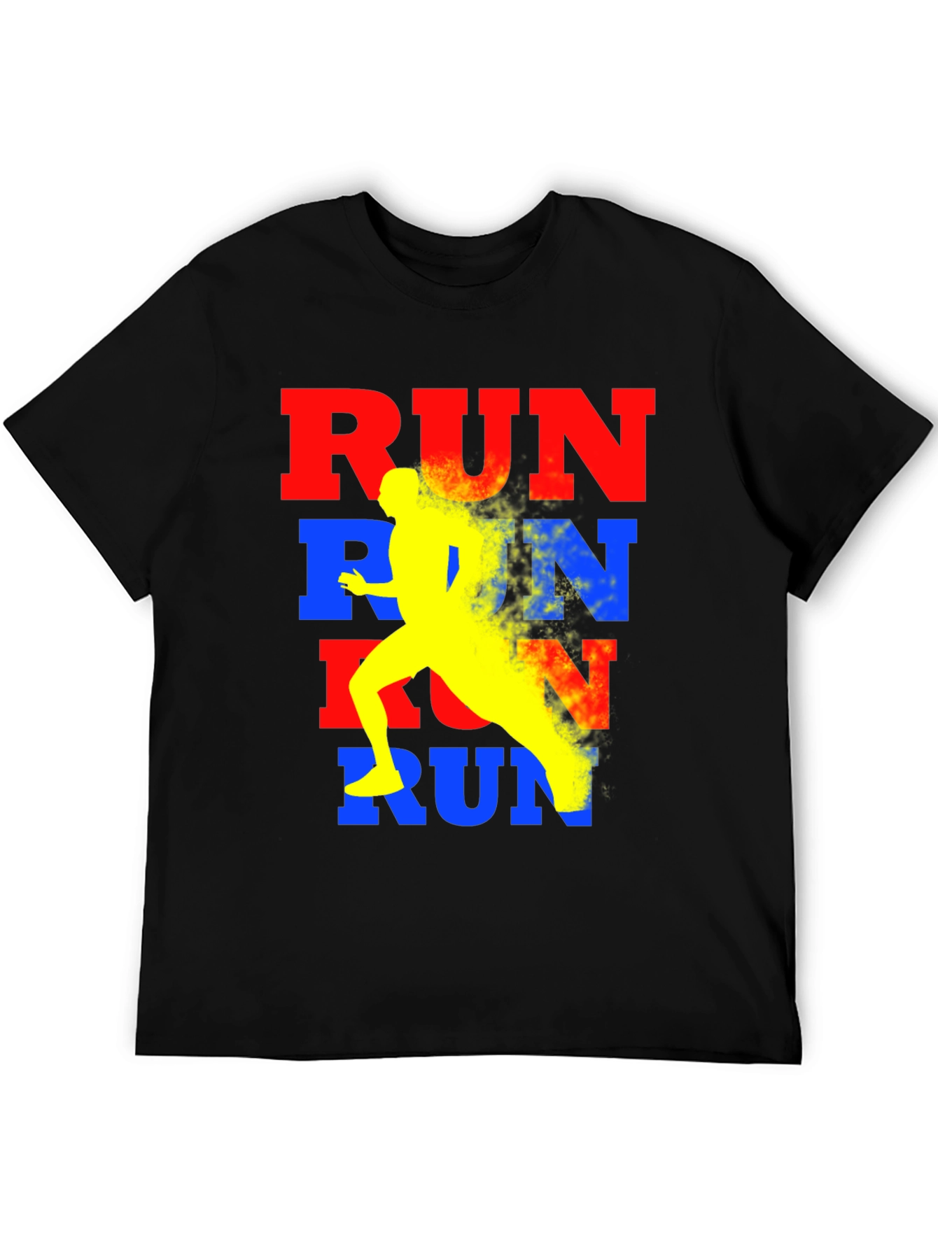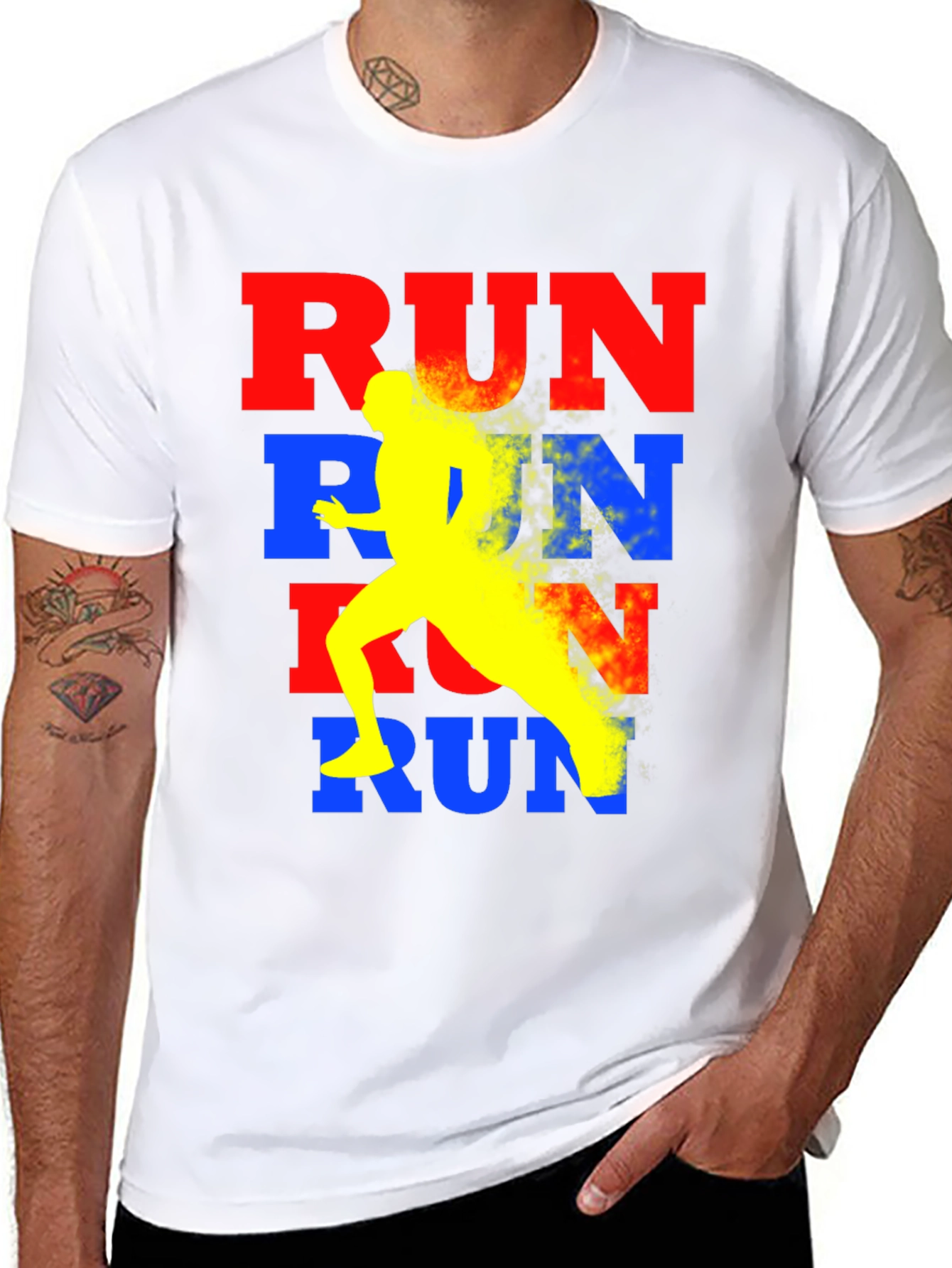 Elevate your workout style with this eye-catching graphic tee. Featuring a bold design with the word 'RUN' stacked vertically in red and blue with a yellow runner silhouette. This tee is perfect for athletes, fitness enthusiasts, or anyone who appreciates a unique and stylish look. The shirt appears to be made from a soft, comfortable fabric ideal for workouts or casual wear. The classic crew neck and short sleeves offer a relaxed fit. This tee makes a statement whether you're hitting the track, heading to the gym, or simply hanging out. Express your passion for running with this unique tee!