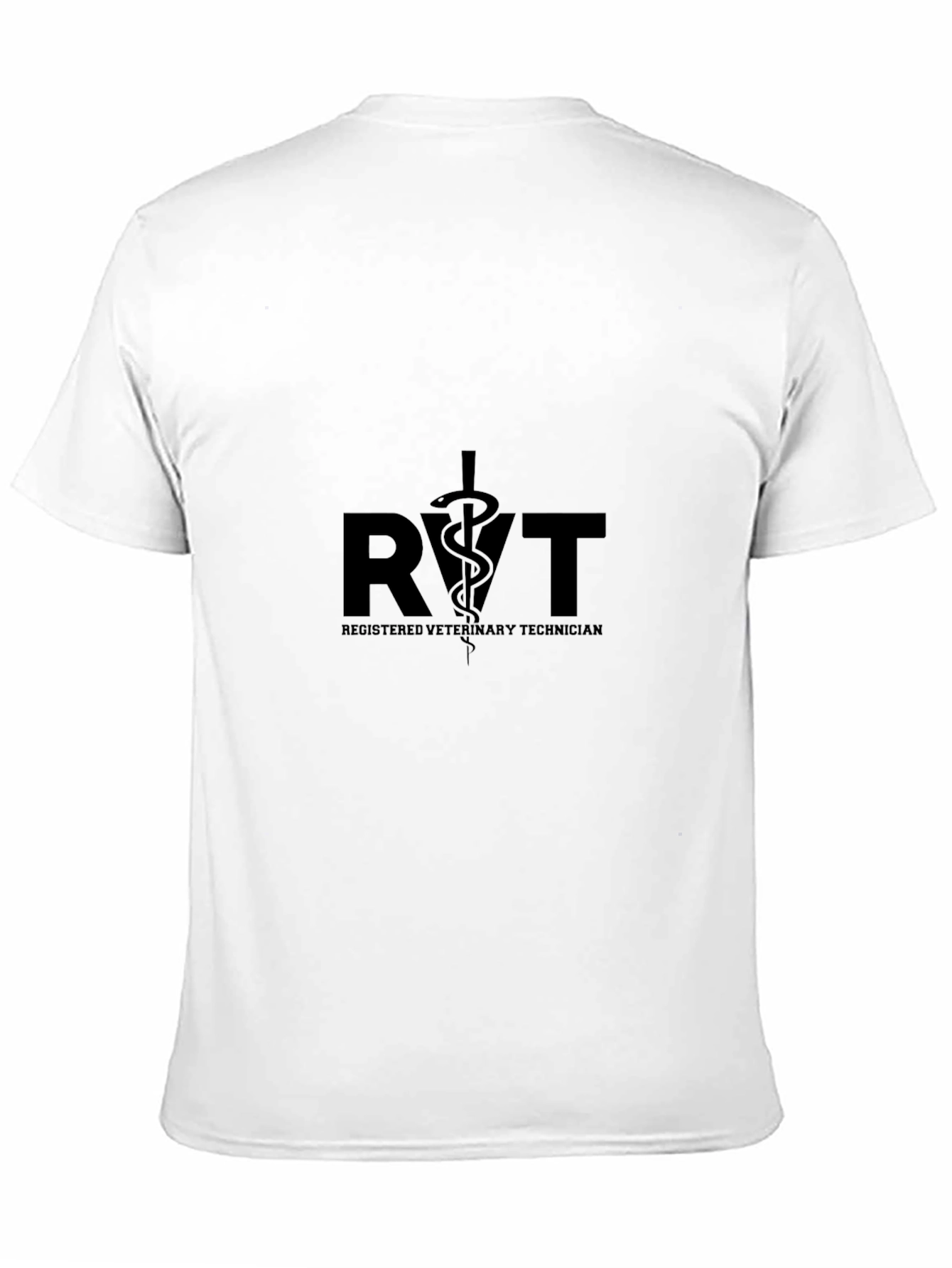 Show your support for Registered Veterinary Technicians with this sleek black t-shirt. The shirt features a bold "RVT" graphic with a caduceus symbol, along with "REGISTERED VETERINARY TECHNICIAN" underneath. Crafted from a soft, comfortable fabric, this tee is perfect for everyday wear. The classic black color makes it easy to pair with any outfit, whether you're at work, running errands, or relaxing at home. This shirt is a great way to show off your profession and spark conversations about the important role RVTs play in animal care.