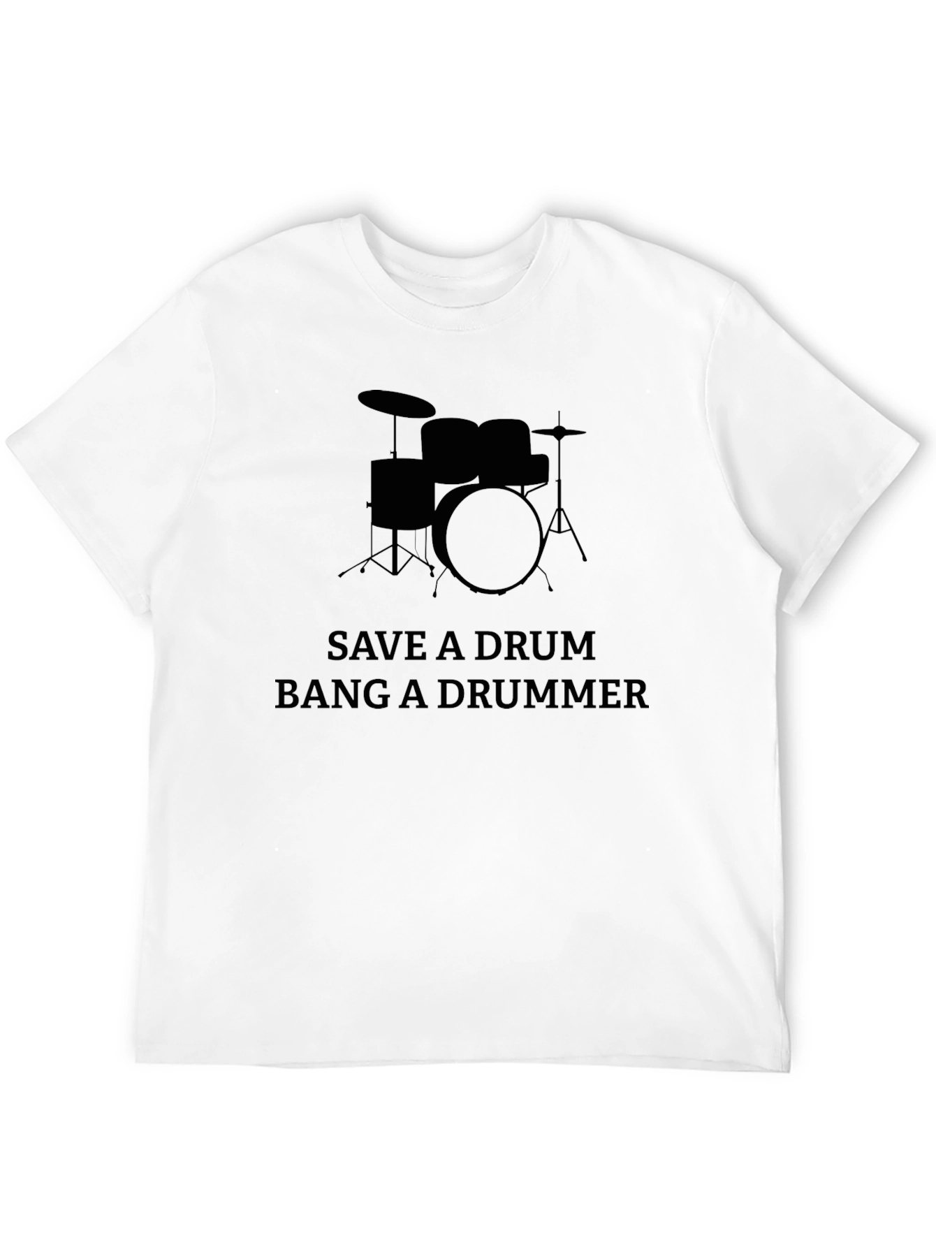 Show off your love for drumming with this unique black t-shirt. The shirt features a silhouette of a drum set graphic, along with the phrase "Save a Drum, Bang a Drummer" printed across the chest. Made from a comfortable-looking, breathable fabric, this tee is perfect for casual wear, band practice, or music events. The design is eye-catching and sure to spark conversation. Get yours today and let everyone know your passion for music!