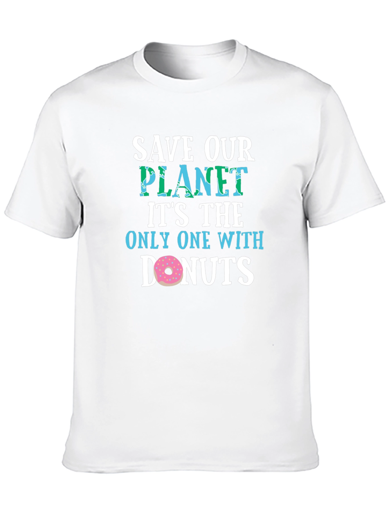 Show your love for the planet and your sweet tooth with this fun black t-shirt! Featuring the message "Save Our Planet It's The Only One With Donuts" in white and shades of blue and green, this shirt is sure to make a statement. The playful design incorporates a pink donut, adding a touch of whimsy. Made from a soft-looking fabric, this tee offers both comfort and style. It's the perfect casual wear for eco-conscious individuals who enjoy a good laugh and have a love for donuts! Ideal for everyday wear, casual outings, or a fun gift for the donut lover in your life.