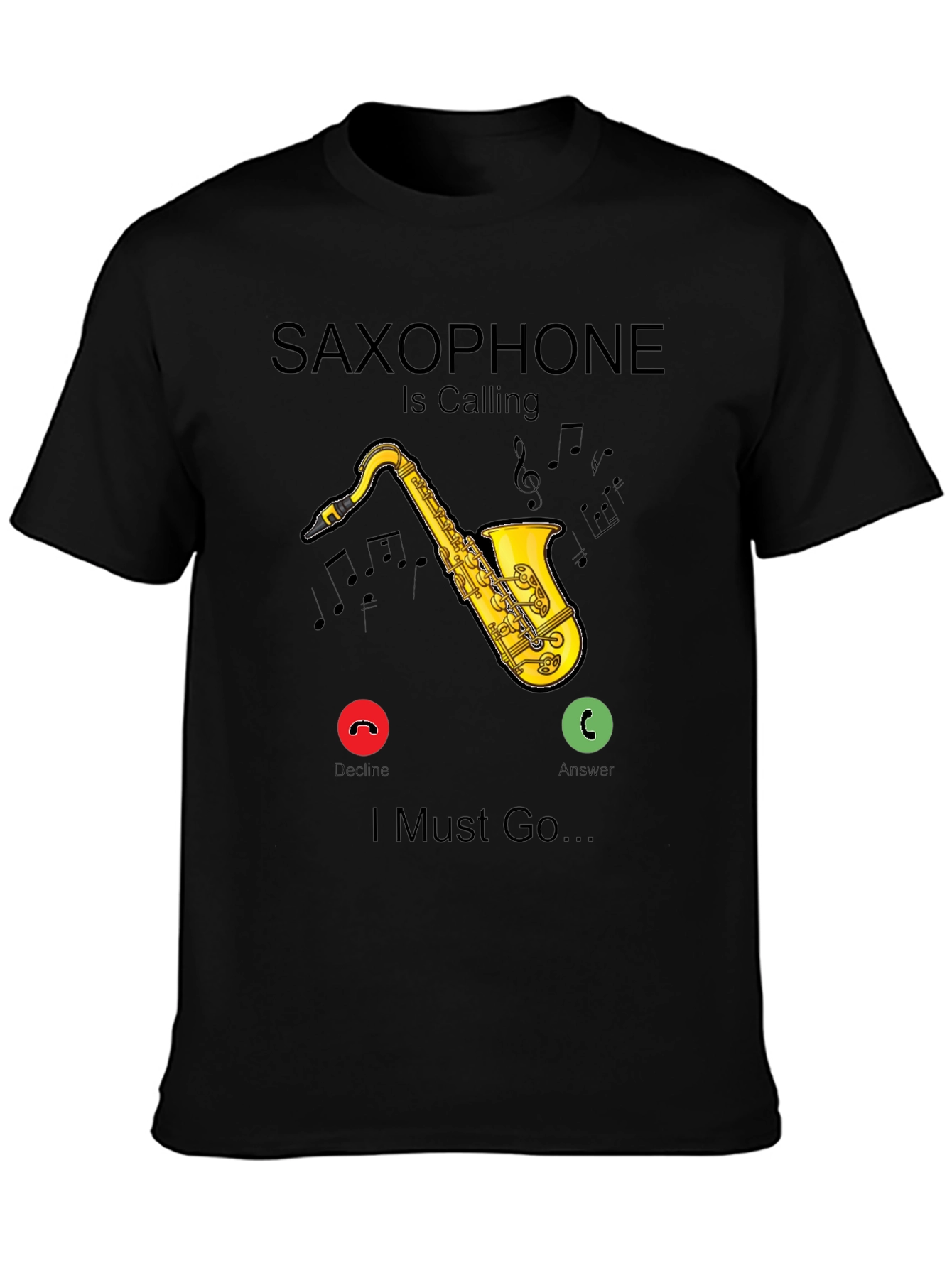 This black t-shirt features a playful design for saxophone enthusiasts. The graphic displays a golden saxophone alongside the text "Saxophone is Calling, I Must Go...", mimicking an incoming call notification. Musical notes subtly accent the design, enhancing its musical theme. Ideal for musicians, music teachers, or anyone passionate about the saxophone, this shirt is a fun way to express your love for music. Comfortable and stylish, it's perfect for casual wear or music events. Grab this unique tee and let everyone know where your heart lies!