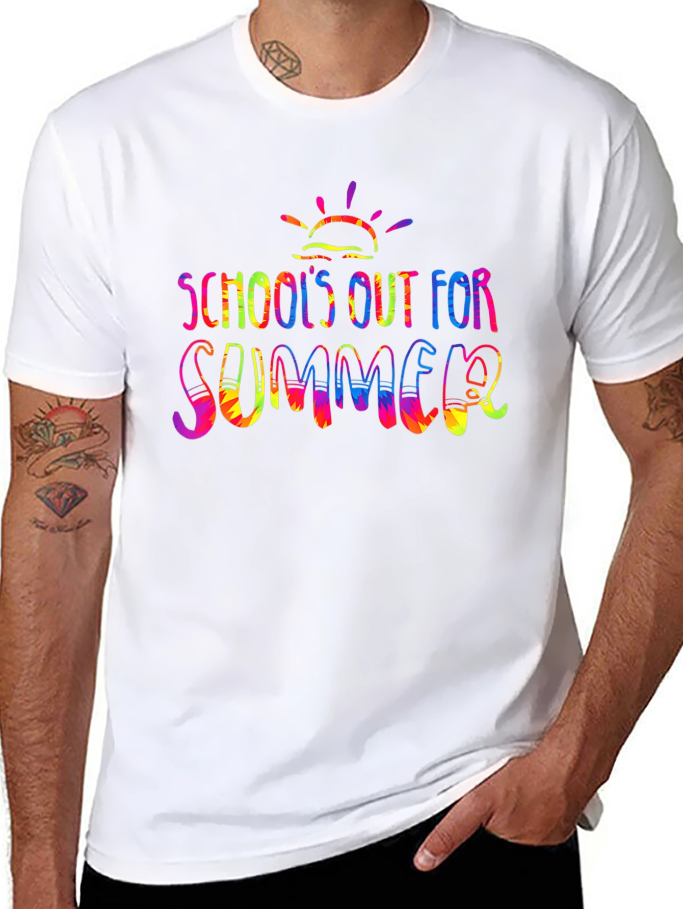Celebrate the end of the school year with this fun and vibrant 'School's Out For Summer' T-shirt! The design features a colorful, tie-dye inspired graphic with a playful sun motif. Perfect for students and teachers alike, this tee is made from a comfortable-looking, breathable fabric, ensuring all-day comfort during those warm summer days. Wear it to end-of-year parties, summer camp, or just lounging around. Let everyone know you're ready for vacation with this cheerful and stylish T-shirt!