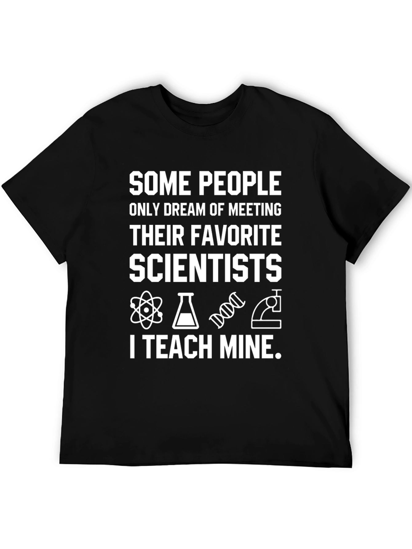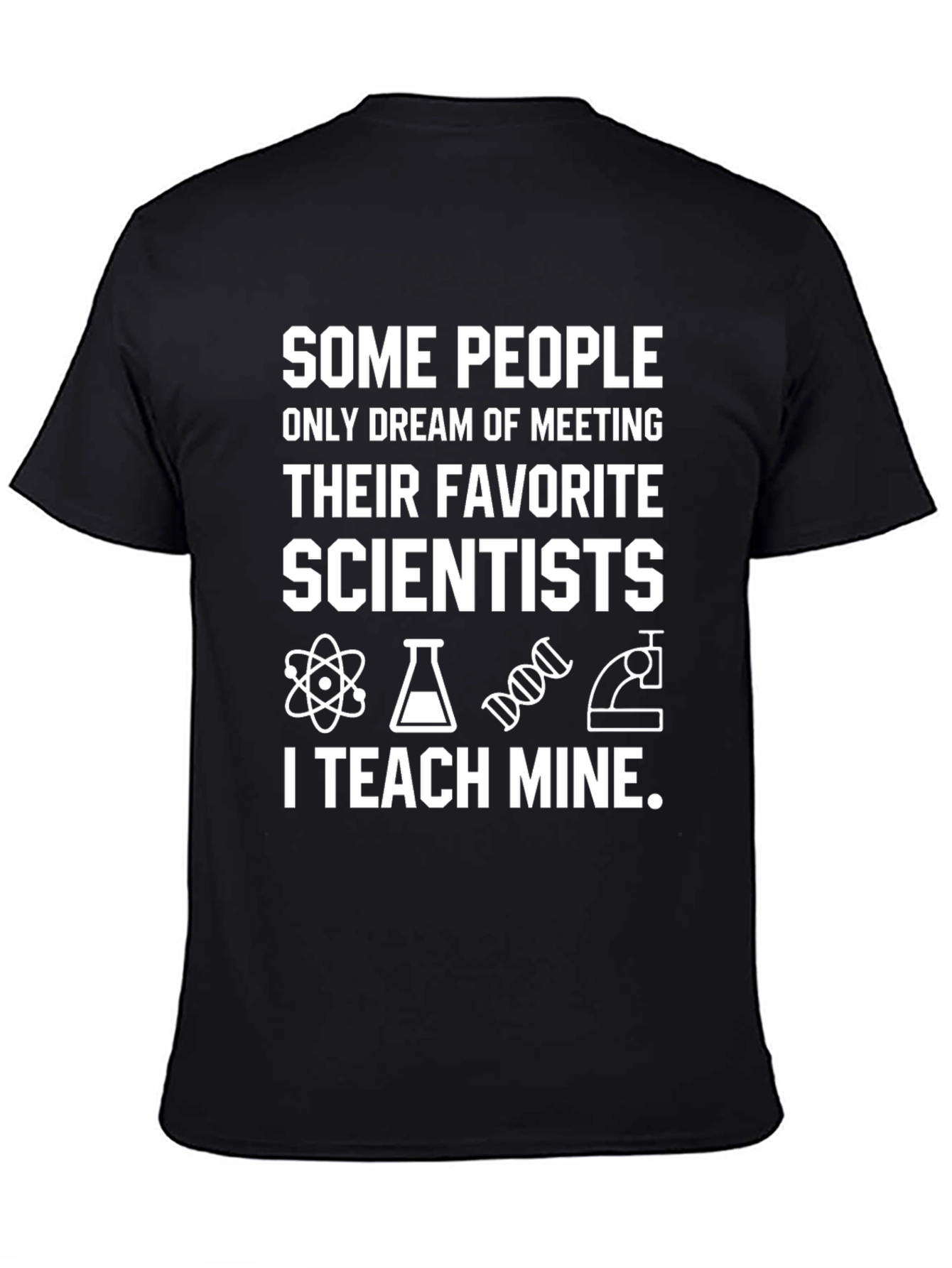 This black T-shirt features a humorous and clever design for science educators. The shirt proclaims, "SOME PEOPLE ONLY DREAM OF MEETING THEIR FAVORITE SCIENTISTS," followed by science-related graphics including an atom, flask, DNA strand, and microscope. The message concludes with "I TEACH MINE." The text is bold and white, creating a striking contrast against the black background of the tee. Made from comfortable fabric, this shirt is perfect for science teachers to wear in the classroom or as casual wear to express their passion for science and education. It's a great conversation starter and a fun way to connect with students and other science enthusiasts.