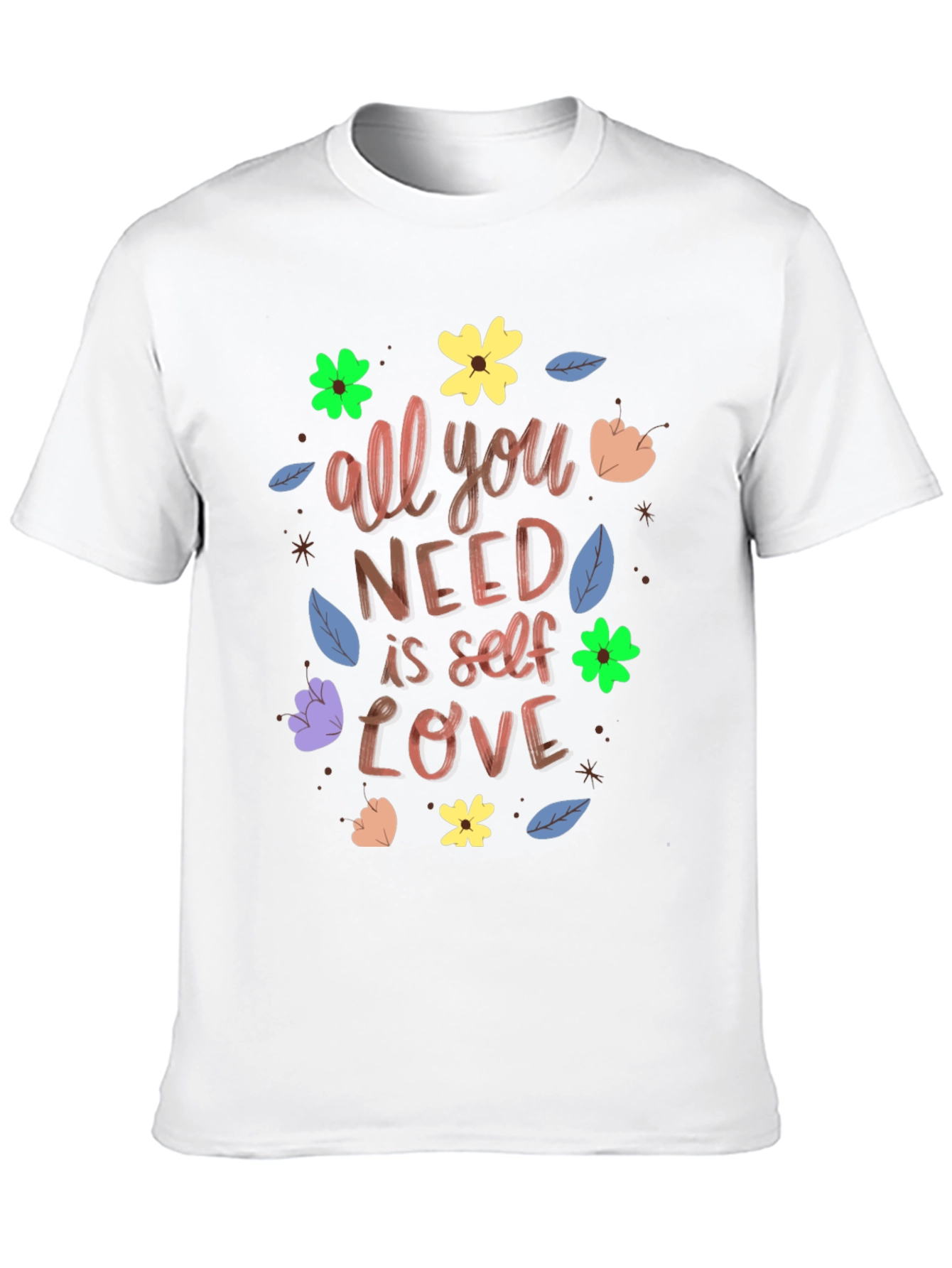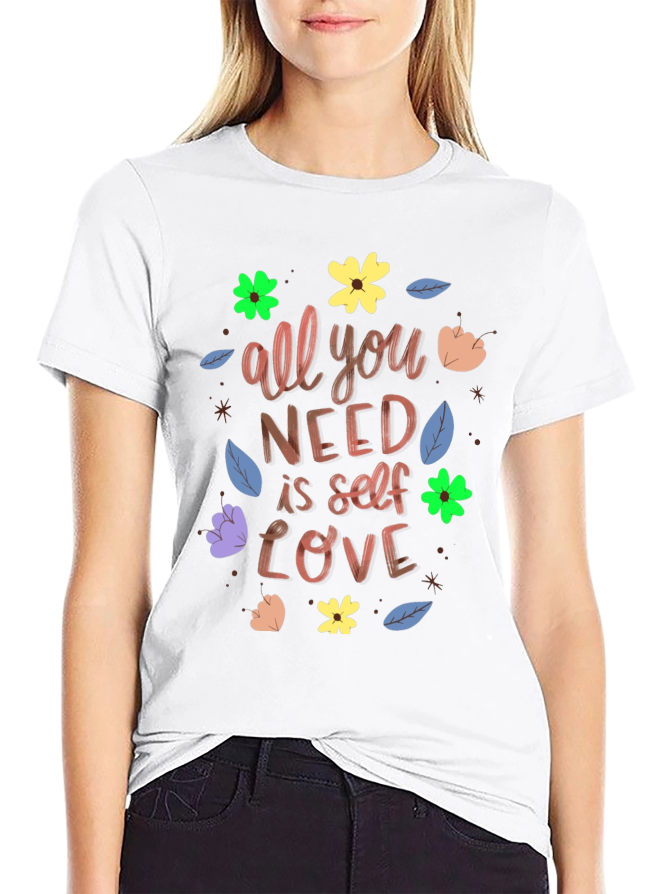 Embrace positivity with this stylish black t-shirt. Featuring a colorful "All You Need Is Self Love" graphic, adorned with floral accents, this tee brings a cheerful vibe to any outfit. Made from a comfortable-looking, breathable fabric, it's perfect for everyday wear. The design is eye-catching, and the fit appears relaxed and flattering. Pair it with jeans for a casual look, or dress it up with a jacket. Express your self-love journey with this unique and inspirational tee. It's a must-have for anyone who values positivity and style.