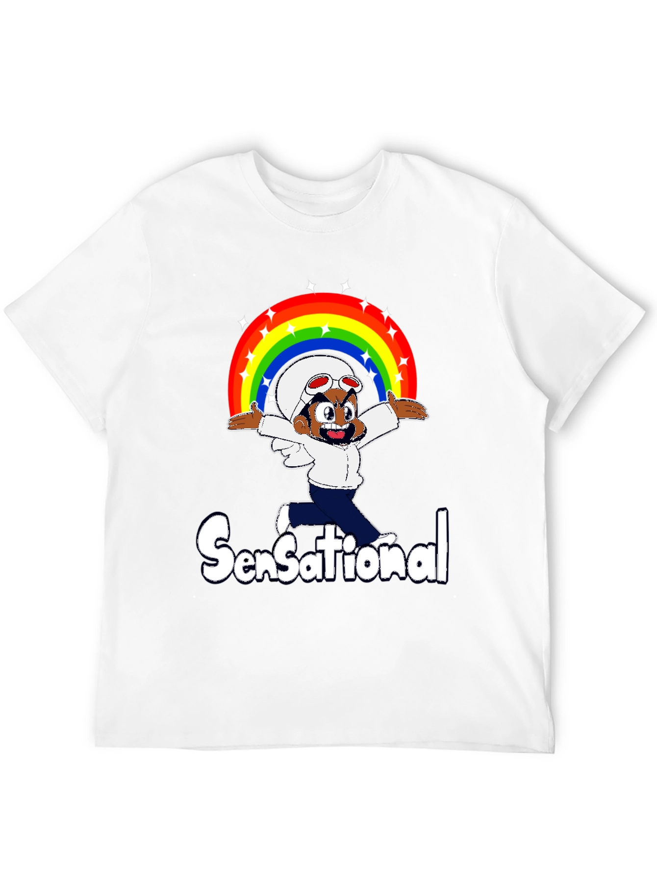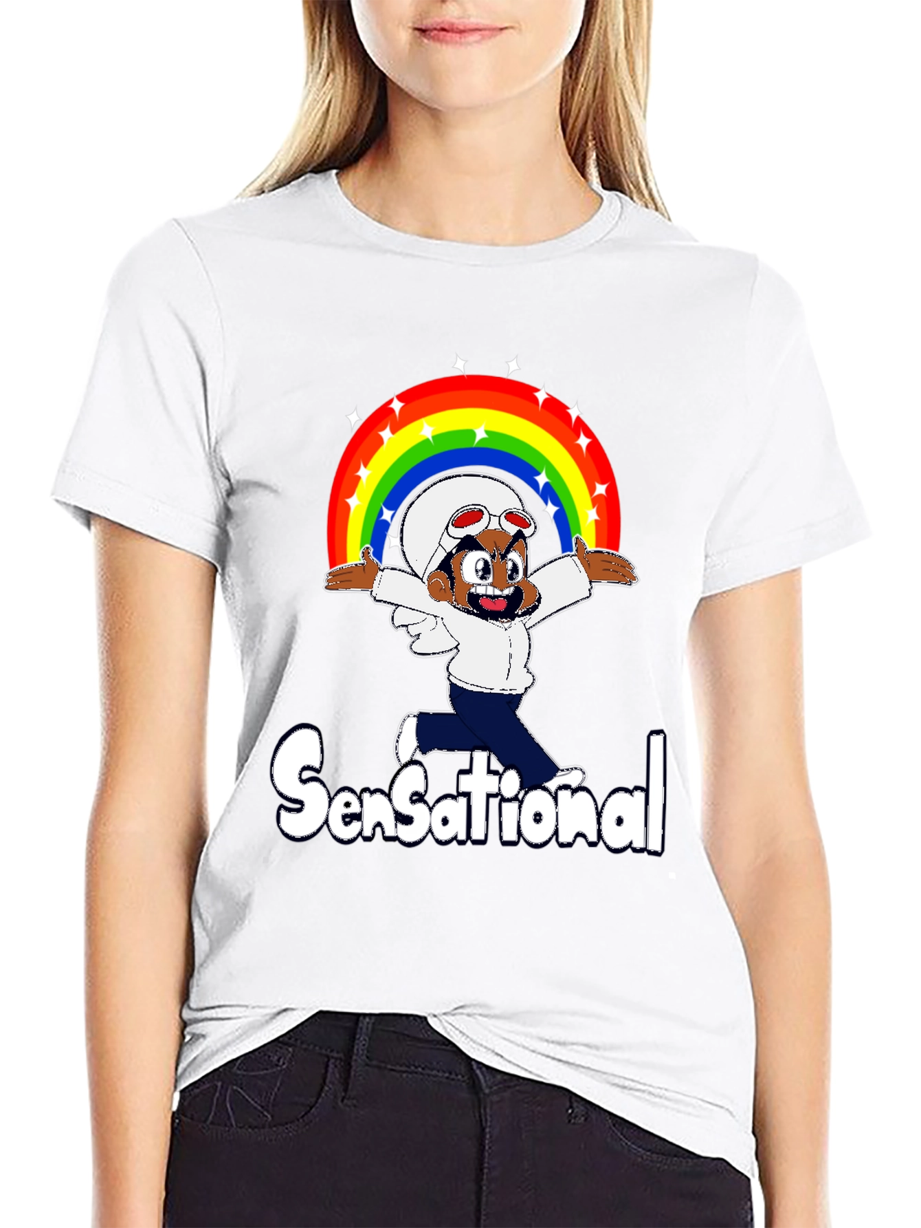 This black t-shirt features a vibrant cartoon character design that's sure to make a statement. The graphic includes a whimsical figure beneath a bright rainbow, adorned with sparkling stars. Below the cartoon is the word "Sensational" in a stylized font. The design is printed on what appears to be a soft and comfortable fabric, ideal for everyday wear. This tee is perfect for adding a touch of fun and personality to your wardrobe. Show off your unique style with this eye-catching and sensational t-shirt!