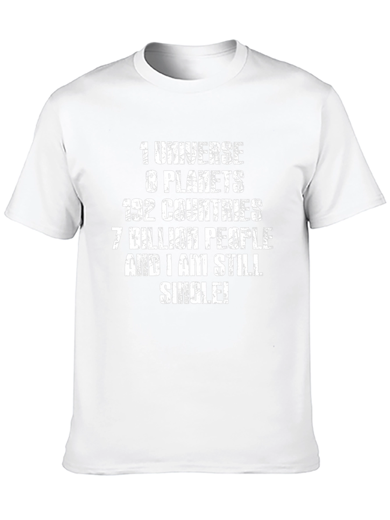 This black t-shirt features a humorous graphic print for those who are single. The design includes the words '1 Universe, 8 Planets, 192 Countries, 7 Billion People, And I am Still Single!' in a distressed white font, making it both eye-catching and fun. Made from what appears to be a soft, comfortable cotton blend, this tee is perfect for casual wear. It's an ideal conversation starter and a great way to show off your sense of humor. Wear it to social gatherings, on dates, or just while relaxing at home. This tee makes a great gift for single friends or family members who appreciate a good laugh. Get yours today and wear your single status with pride!
