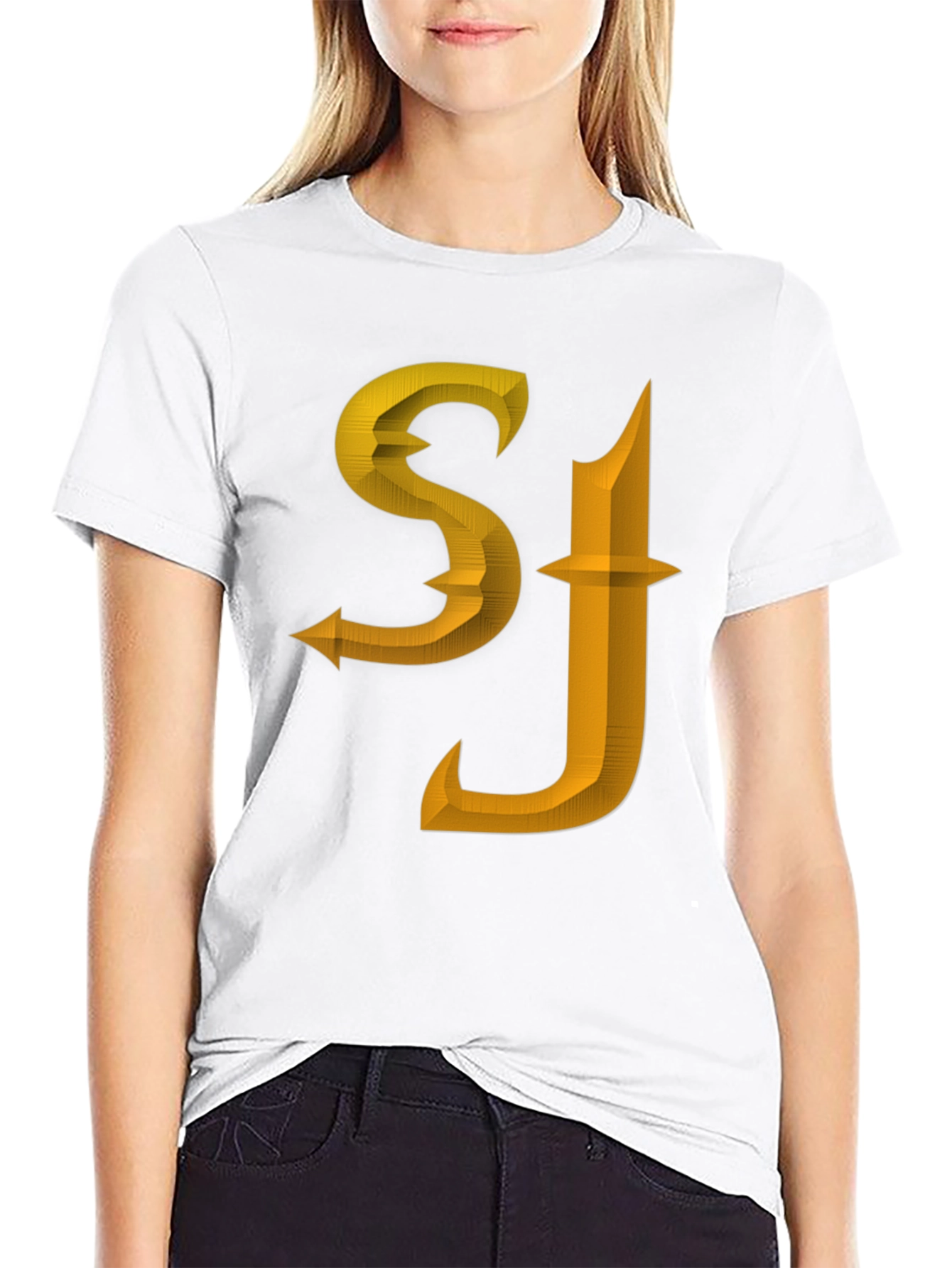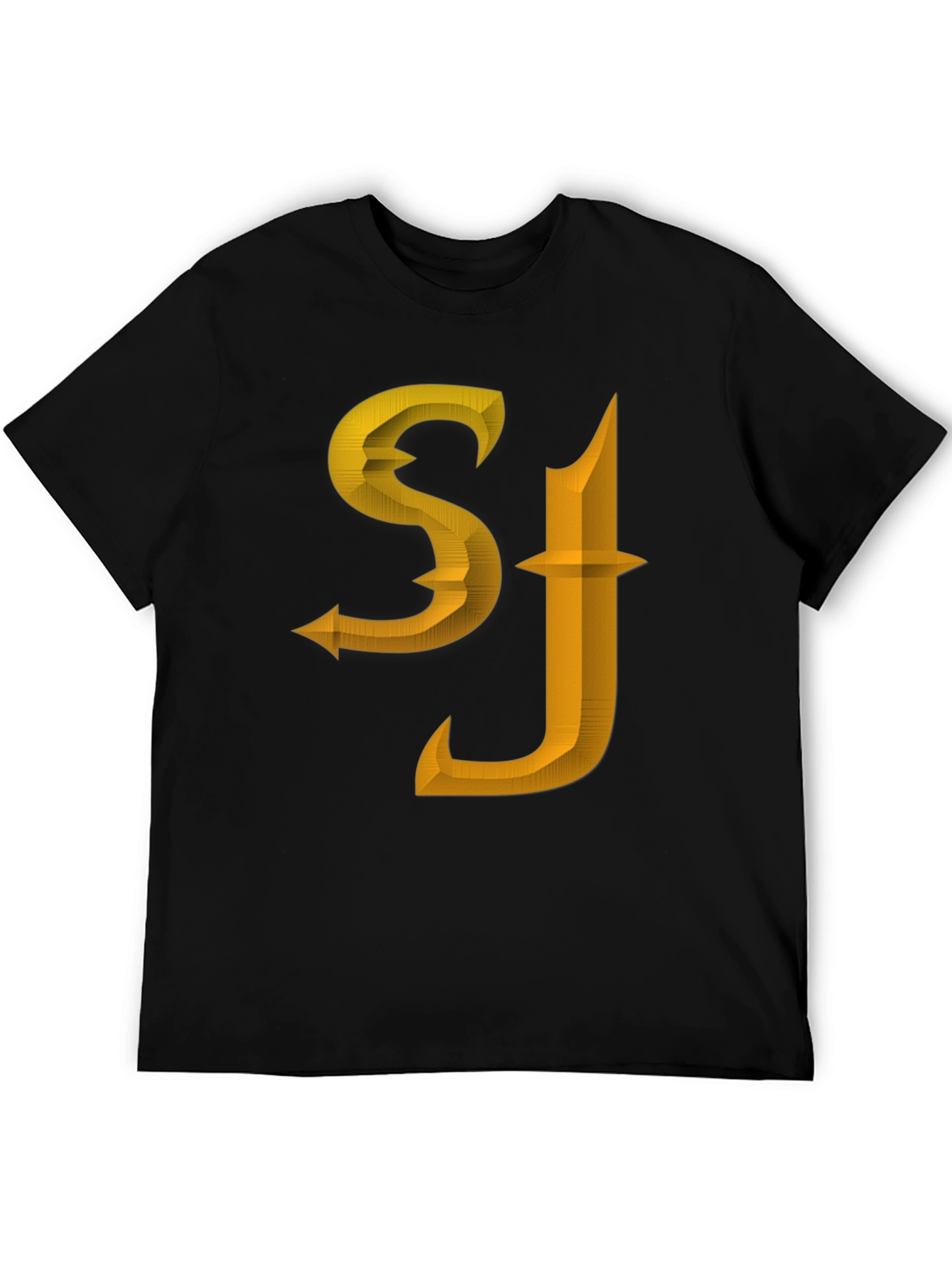 Showcase your style with this striking black tee featuring bold 'SJ' initials in a textured gold design. The unique, dimensional font adds a modern edge to this classic crew neck shirt. Made from a comfortable-looking material, this tee is perfect for casual wear, concerts, or making a statement. Pair it with jeans or shorts for an effortlessly cool look. Elevate your wardrobe with this standout piece!