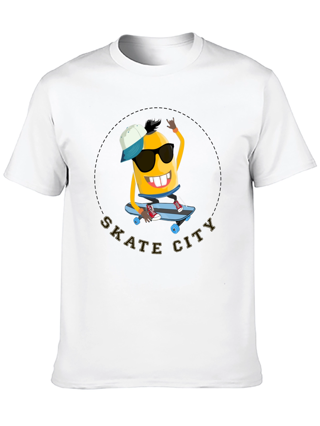 Show off your fun side with this cool black t-shirt! The shirt features a cartoon banana character riding a skateboard inside a circular "Skate City" design. The minion has a backwards baseball cap, sunglasses, and shows off some pearly whites. This unique tee is perfect for casual wear, skate park hangs, or anyone who loves quirky graphic designs. The dark color makes it versatile for styling with jeans, shorts, or your favorite athletic wear. Add some fun style to your wardrobe with this cool t-shirt!