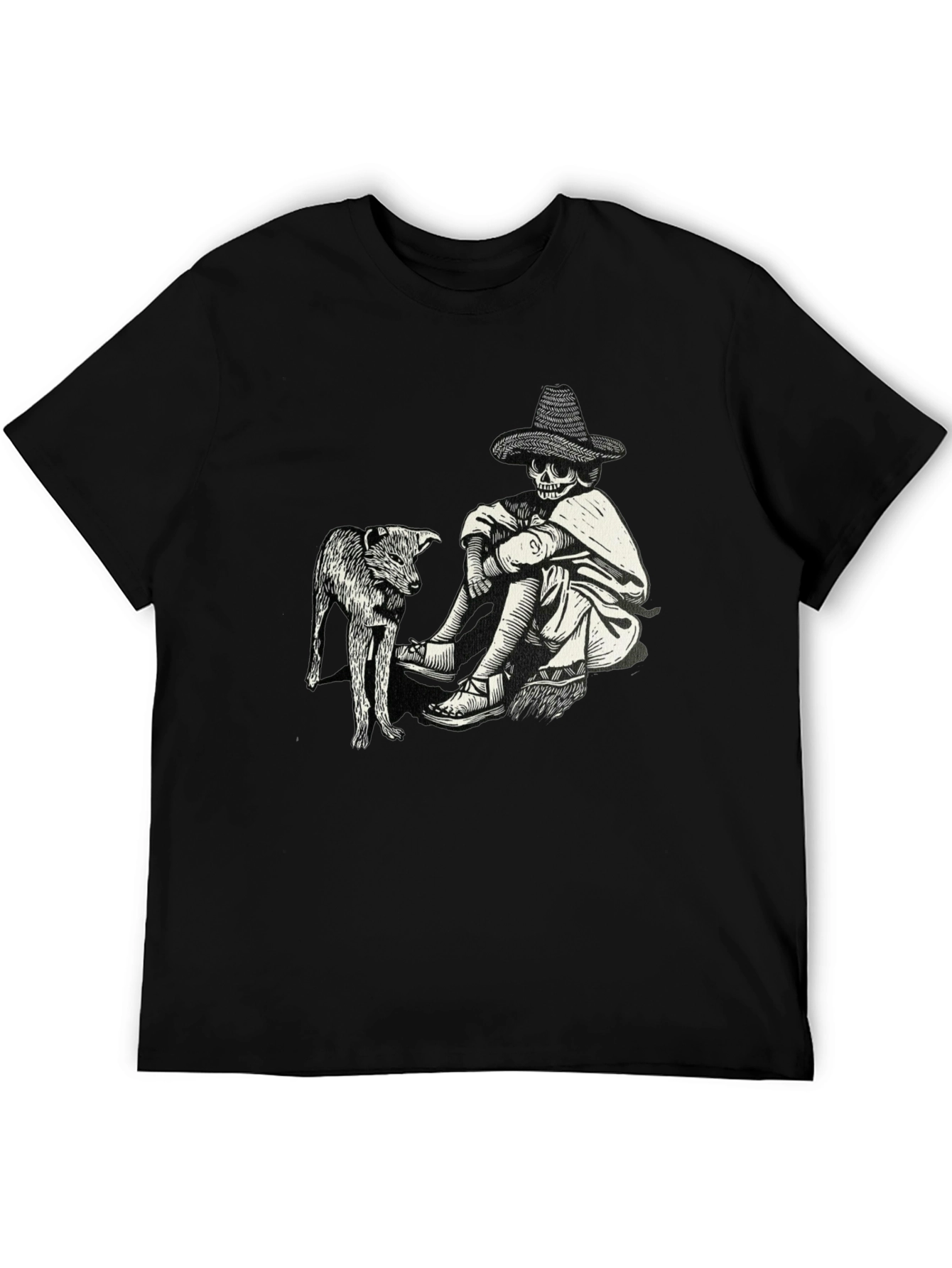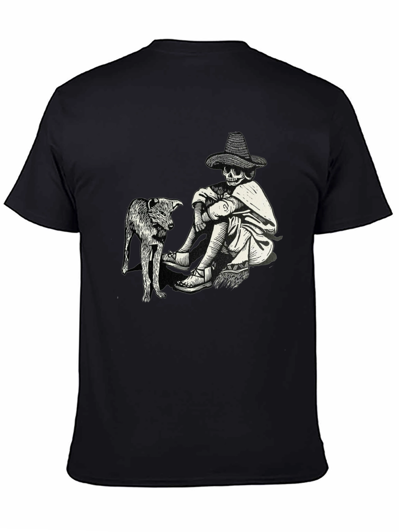 This black t-shirt features a unique and intriguing graphic design of a skeleton in traditional attire, accompanied by a dog-like creature. The detailed artwork stands out vividly against the dark background, creating a bold and eye-catching statement piece. Made from comfortable, breathable fabric, this tee is perfect for casual wear, concerts, or making a statement. Show off your unique style with this stand-out garment. It's not just a shirt; it's a conversation starter. Ideal for those who appreciate artistic and culturally-inspired designs.