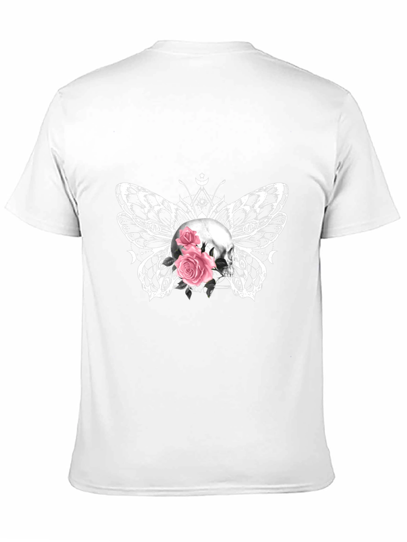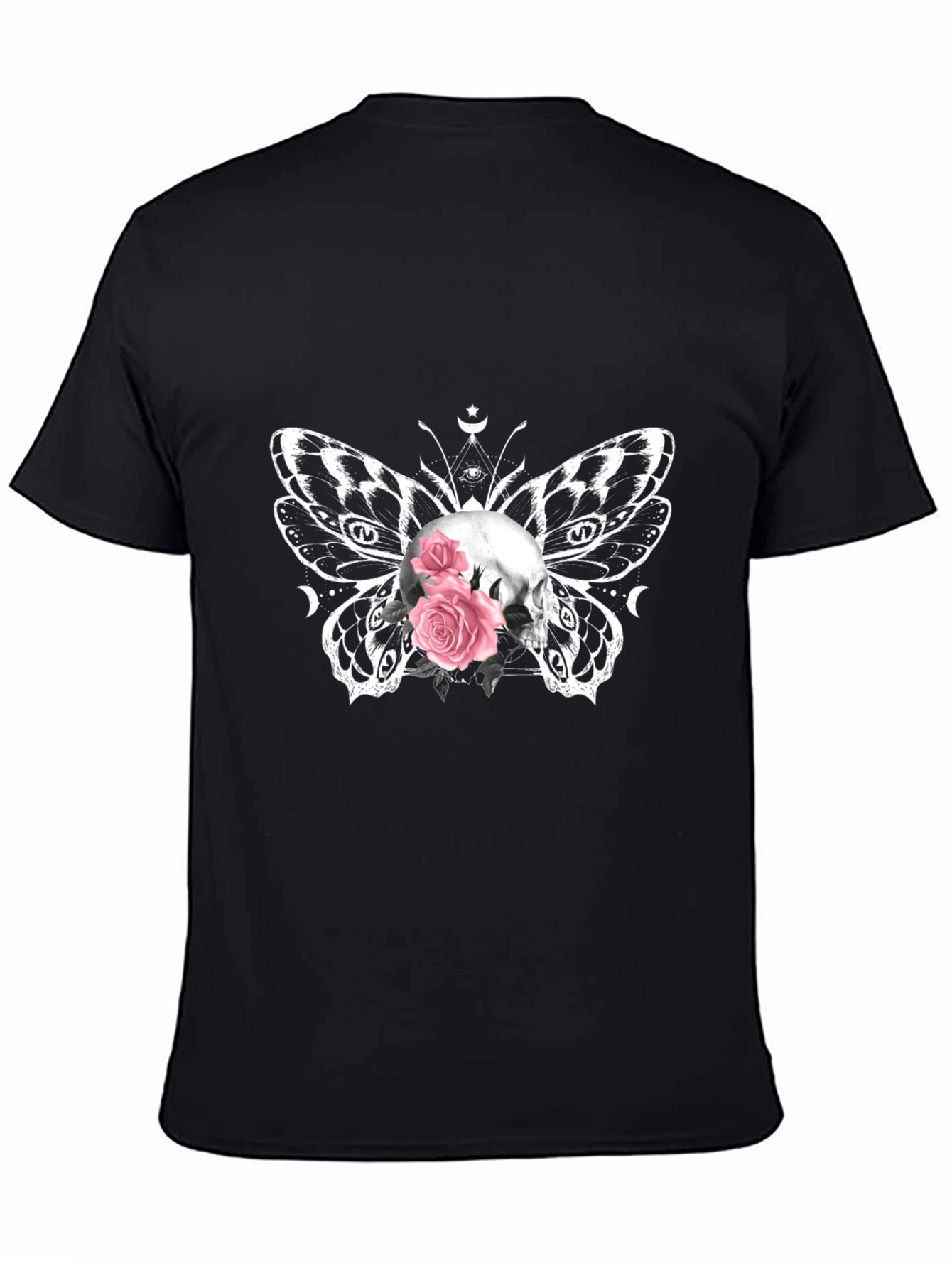 This striking black t-shirt features a captivating graphic design. It showcases a skull intricately blended with butterfly wings, adorned with delicate pink roses. The design has an ethereal, gothic feel. The shirt appears to be made from a soft, comfortable cotton blend, perfect for everyday wear. Ideal for those who appreciate unique and edgy fashion, this tee can be dressed up or down. Wear it with jeans for a casual look or pair it with a skirt for a more alternative style. This tee is a statement piece that's sure to turn heads and spark conversations.
