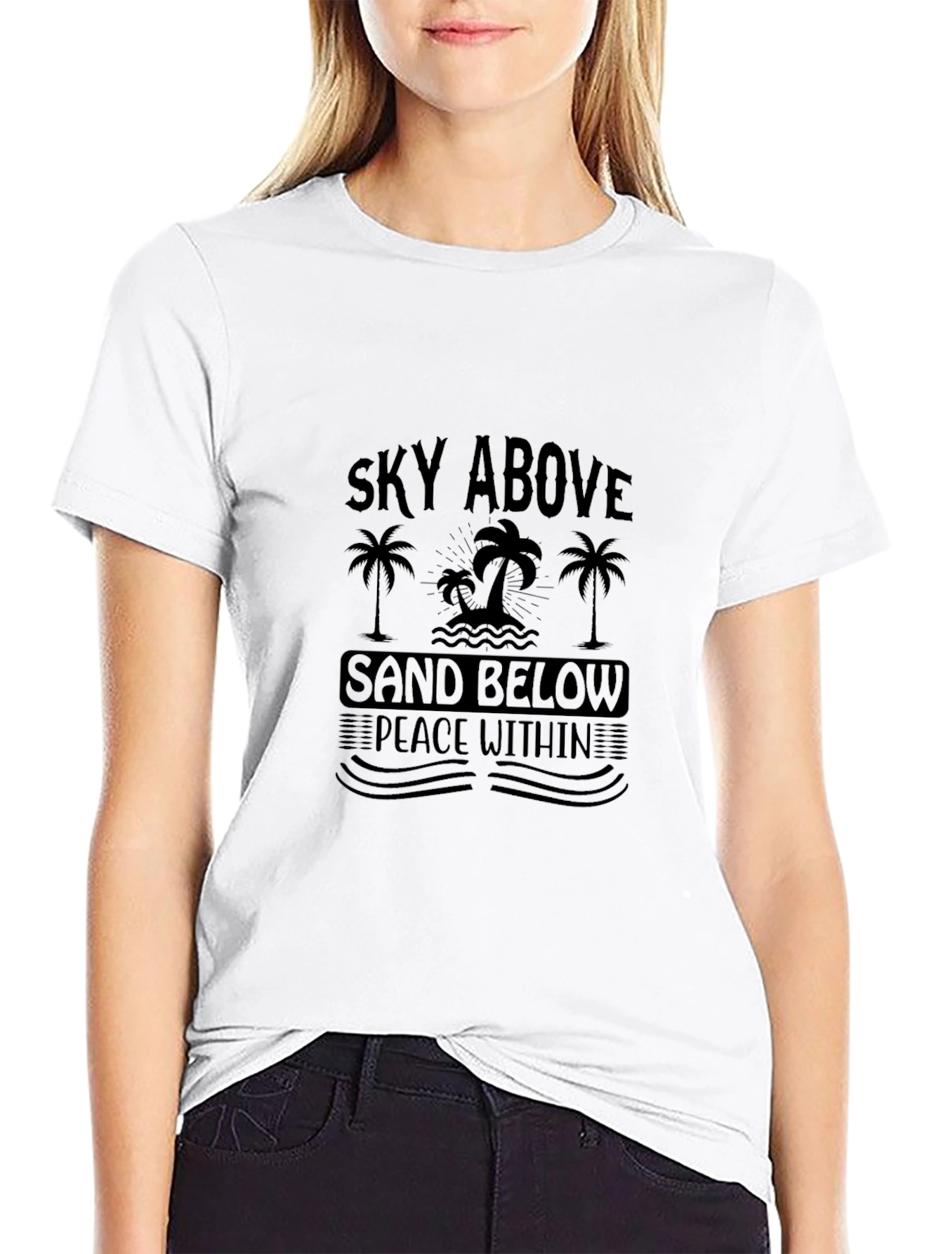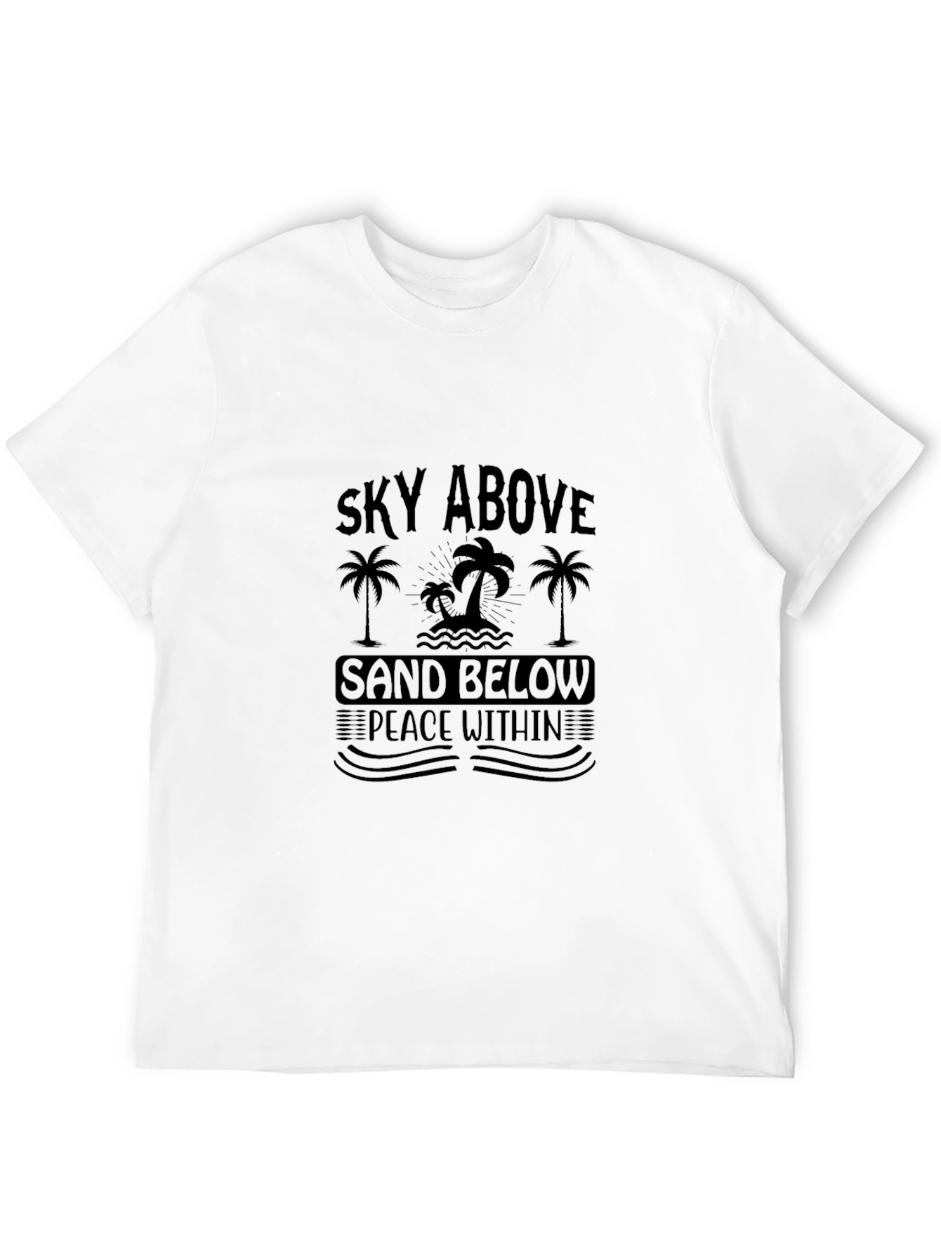 Embrace the beach vibes with this stylish black graphic tee! Featuring a cool design with palm trees, an island, and the words "Sky Above Sand Below Peace Within", this shirt is perfect for any casual occasion. The classic fit and soft fabric offer all-day comfort, making it ideal for beach days, summer outings, or just lounging around. Show off your love for the ocean with this must-have addition to your wardrobe. Grab yours now and feel the ocean breeze!