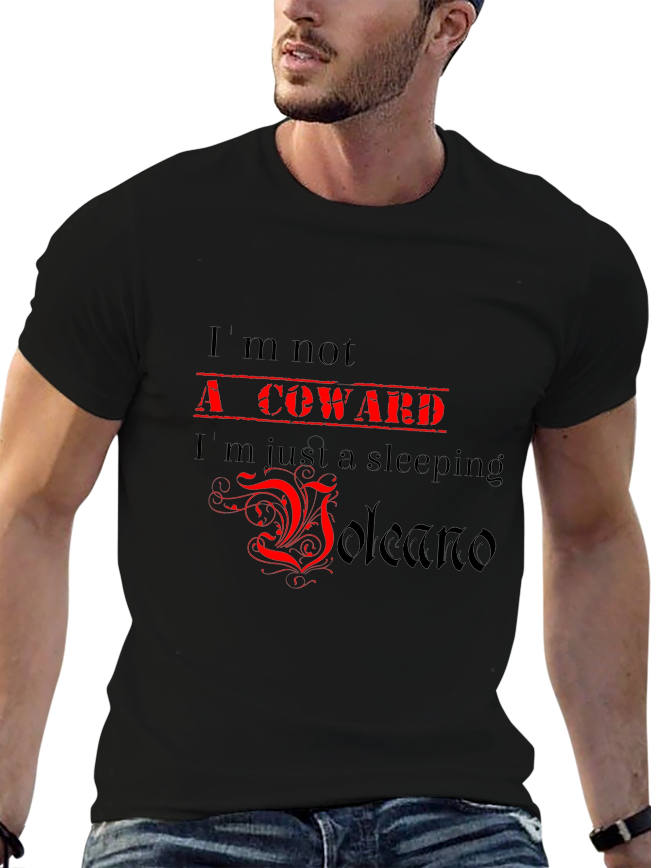 Make a statement with this eye-catching black graphic tee. The shirt features a striking design with the text "I'm not a coward. I'm just a sleeping volcano" in contrasting black and red fonts. The word "COWARD" is emphasized in red, while a decorative red flourish accentuates the "volcano" text. Made from a comfortable material, this tee offers both style and ease of wear. Its classic fit makes it suitable for various casual occasions. Perfect for expressing your personality and adding an edgy touch to your wardrobe. Get ready to unleash your inner volcano!
