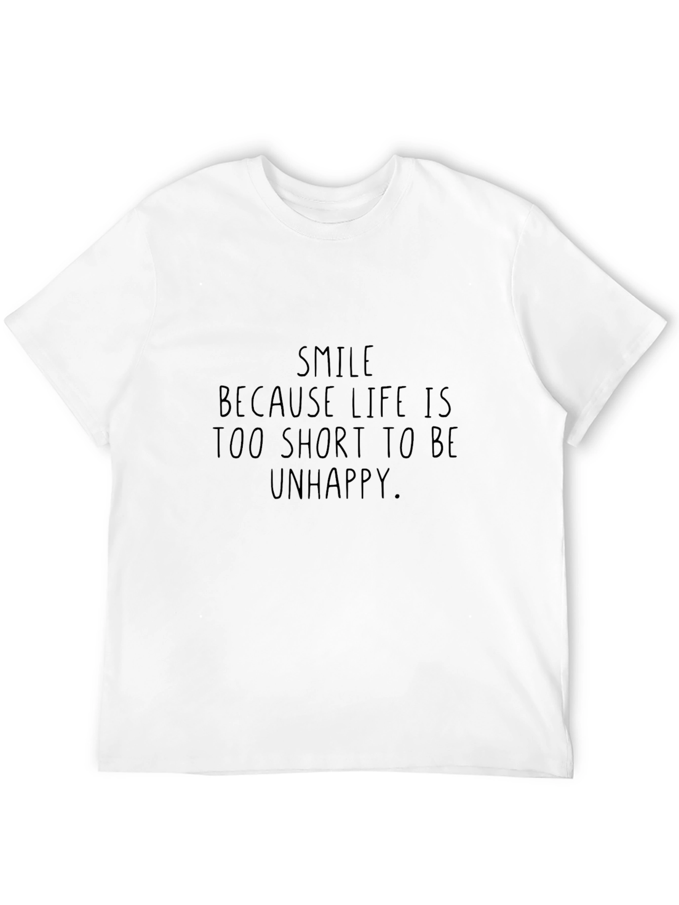 This classic black t-shirt features a motivational message, "Smile because life is too short to be unhappy." The design is simple, yet the message is powerful, making it a great conversation starter. It's made from a comfortable, breathable fabric, this tee is ideal for everyday wear. Dress it up with a blazer or wear it casually with jeans. This versatile shirt is perfect for anyone looking to spread positivity and add a touch of inspiration to their wardrobe. Get yours today and start smiling!