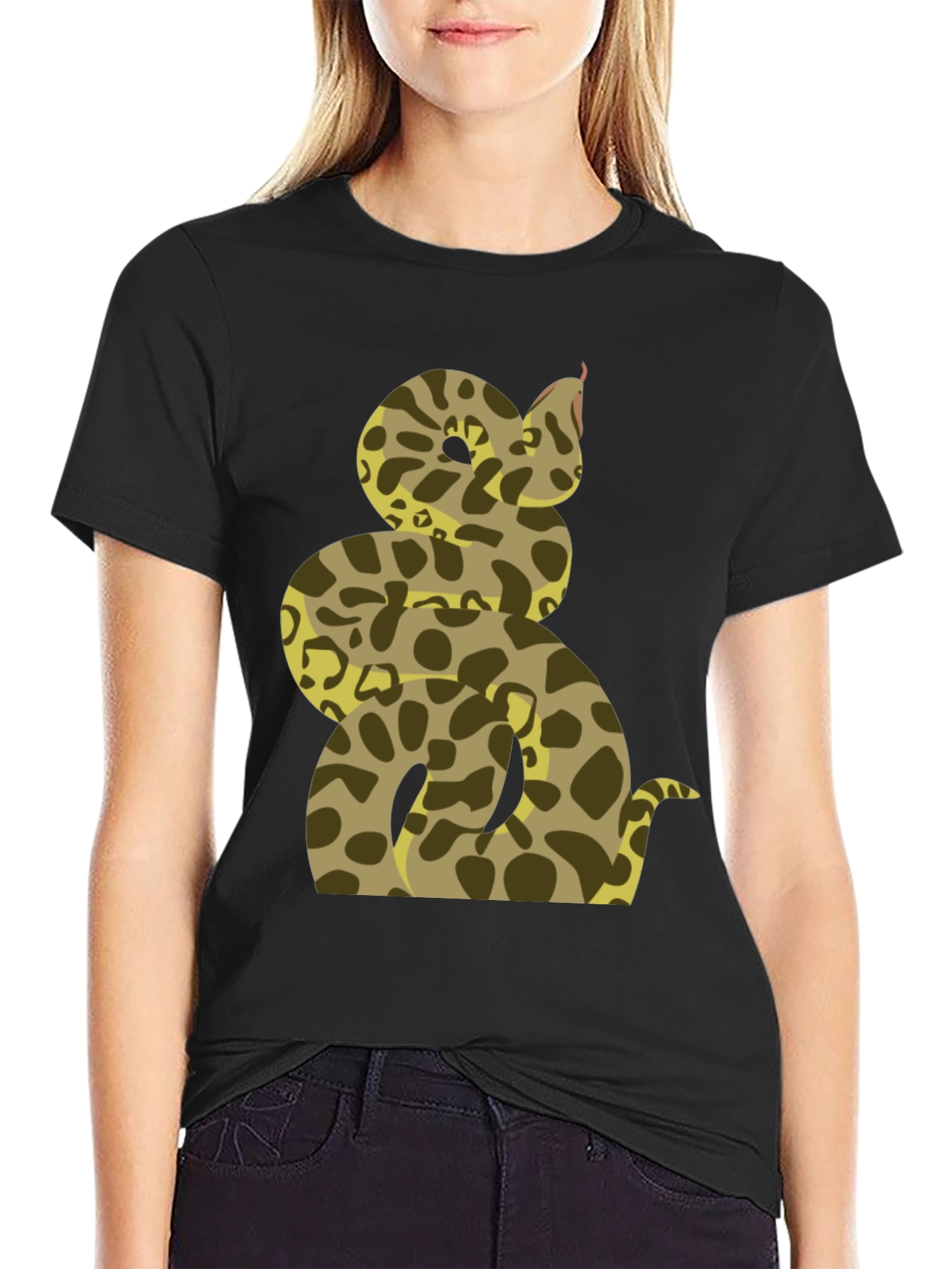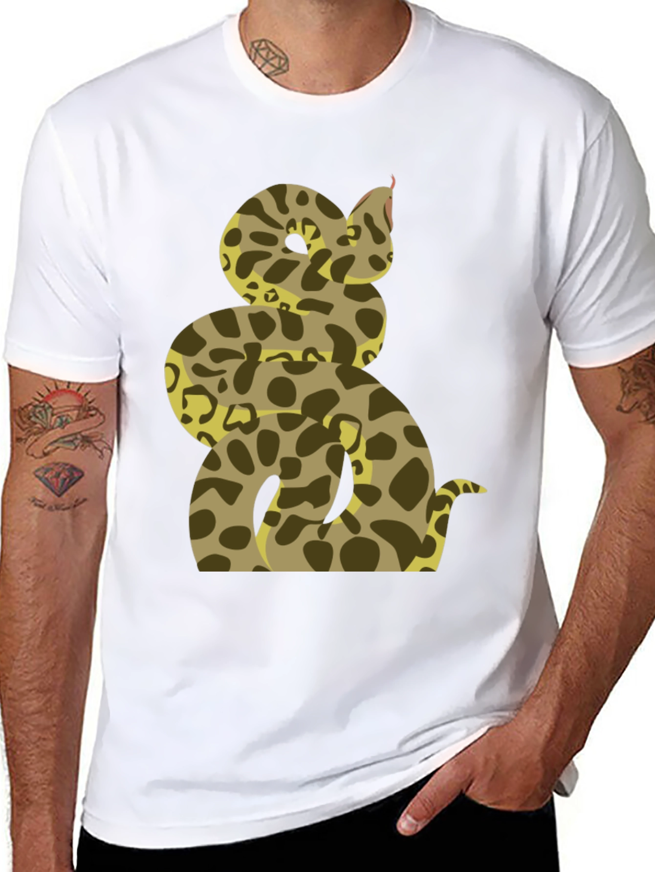 Show off your wild side with this striking men's t-shirt. Featuring a bold snake print, the design showcases a coiled serpent in earthy tones of tan and brown against a classic black backdrop. The detailed graphic wraps around the torso, creating a visually captivating statement piece. Made from comfortable, breathable fabric, this tee is perfect for everyday wear or casual outings. Pair it with jeans or shorts for a relaxed yet stylish look. Elevate your wardrobe with this eye-catching and unique snake design.