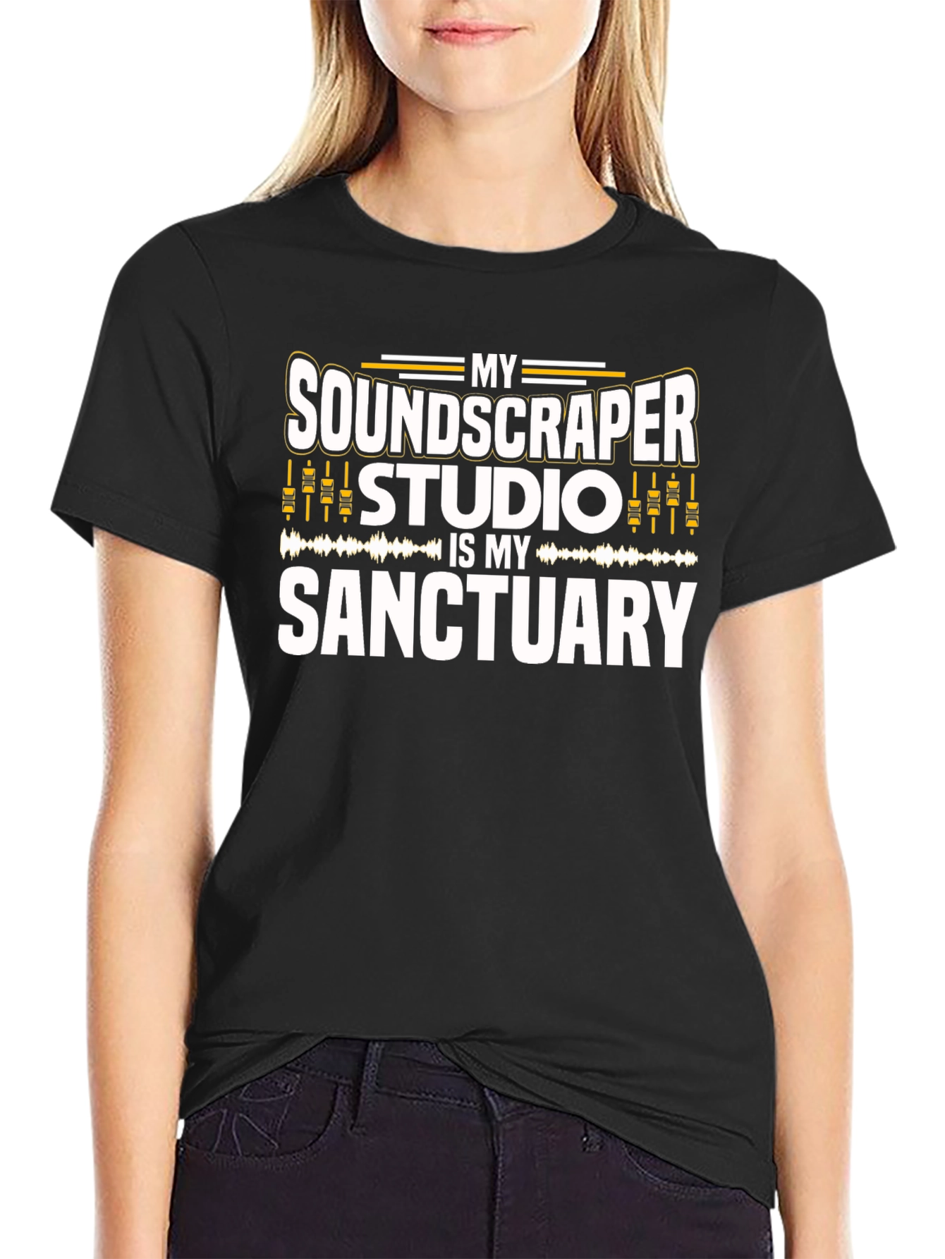 Embrace your passion for sound with this unique black t-shirt. The bold design features the phrase "My Soundscaper Studio Is My Sanctuary" in a stylized font, perfect for music producers, sound engineers, and audio enthusiasts. The graphic incorporates sound wave visuals and equalizer-style accents, adding a touch of professional flair. Made from a comfortable-looking fabric, this shirt is ideal for wearing in the studio, at gigs, or as a casual statement piece. Let the world know that your studio is your happy place with this must-have tee!