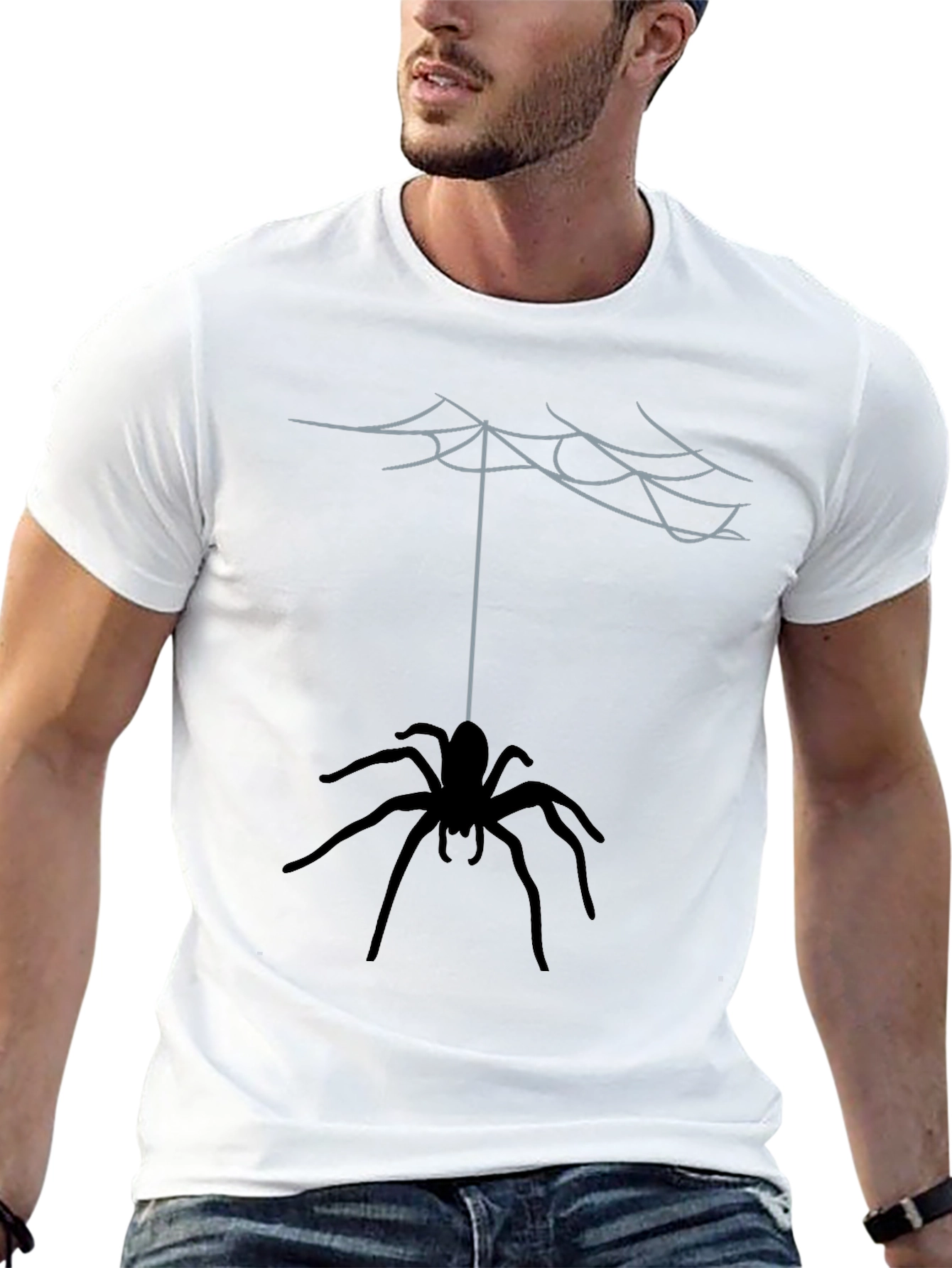 Embrace spooky season with this eye-catching black t-shirt! Featuring a unique graphic of a spider dangling from its web, this tee is perfect for Halloween or anyone who loves a touch of dark humor. The design is prominently displayed on the front, creating a bold and stylish statement. Made from a comfortable and durable fabric, this shirt is suitable for everyday wear. Pair it with jeans or shorts for a casual, cool look. A great conversation starter and a fun addition to any wardrobe!
