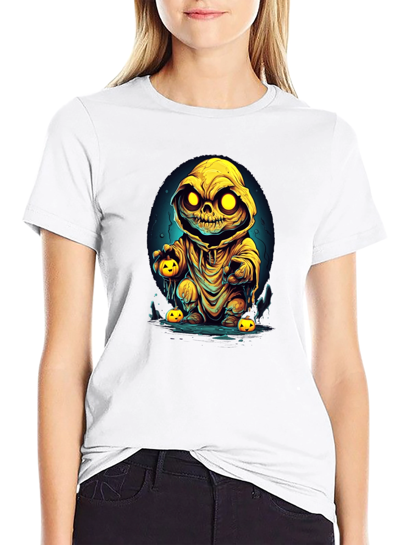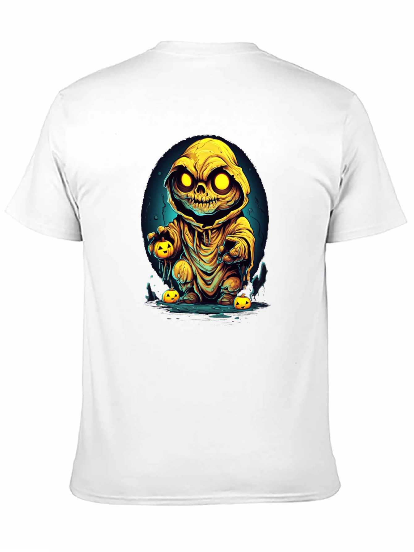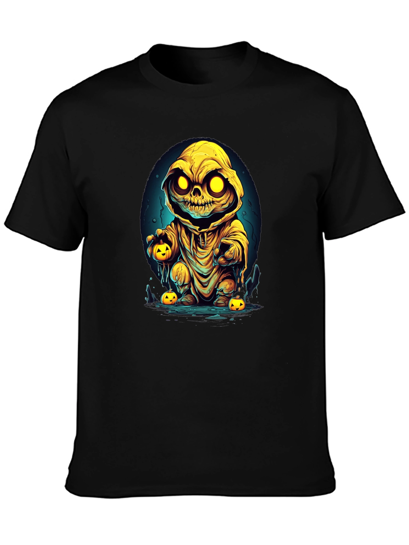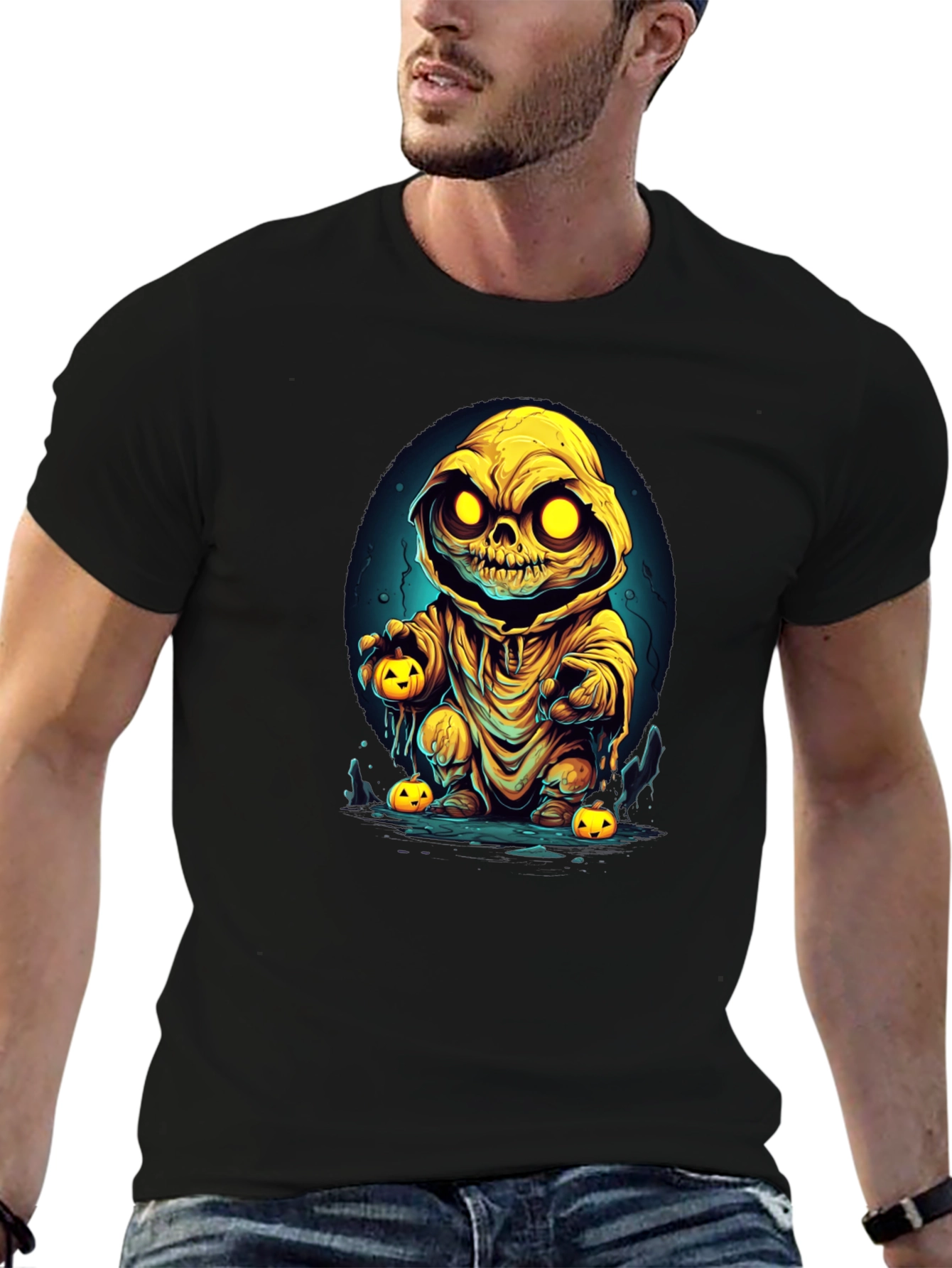 Embrace the spirit of Halloween with this unique graphic tee! Featuring a cartoonish yet eerie pumpkin character in a hooded robe, this t-shirt is perfect for anyone who loves spooky season. The vibrant, eye-catching design is printed on a comfortable black fabric, making it ideal for casual wear, parties, or trick-or-treating. The detailed artwork includes glowing eyes and miniature pumpkin companions, adding to its quirky and playful appeal. Dress up your wardrobe with this must-have Halloween-themed piece!
