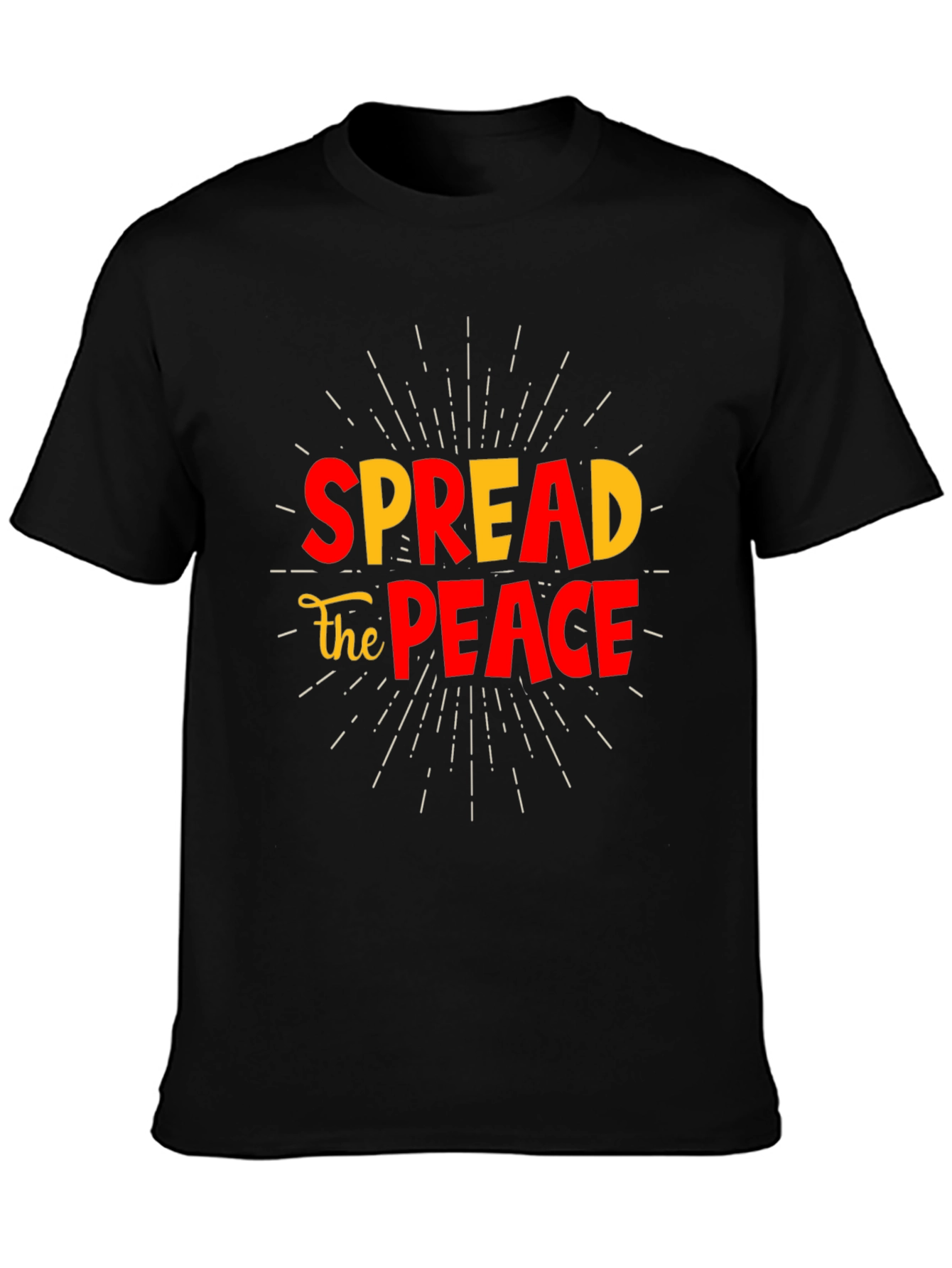 This classic black t-shirt features a vibrant and eye-catching graphic design that promotes positivity and unity. The words "SPREAD" and "PEACE" are prominently displayed in bold, contrasting colors, creating a visually appealing statement. The phrase "the" is elegantly incorporated in a cursive script, adding a touch of sophistication to the design. This tee is likely crafted from a soft and comfortable material, perfect for casual wear. Wear this t-shirt to express your values, spark conversations, and inspire others to spread peace in their own lives. It's a versatile piece suitable for everyday outings, social gatherings, or even relaxing at home.