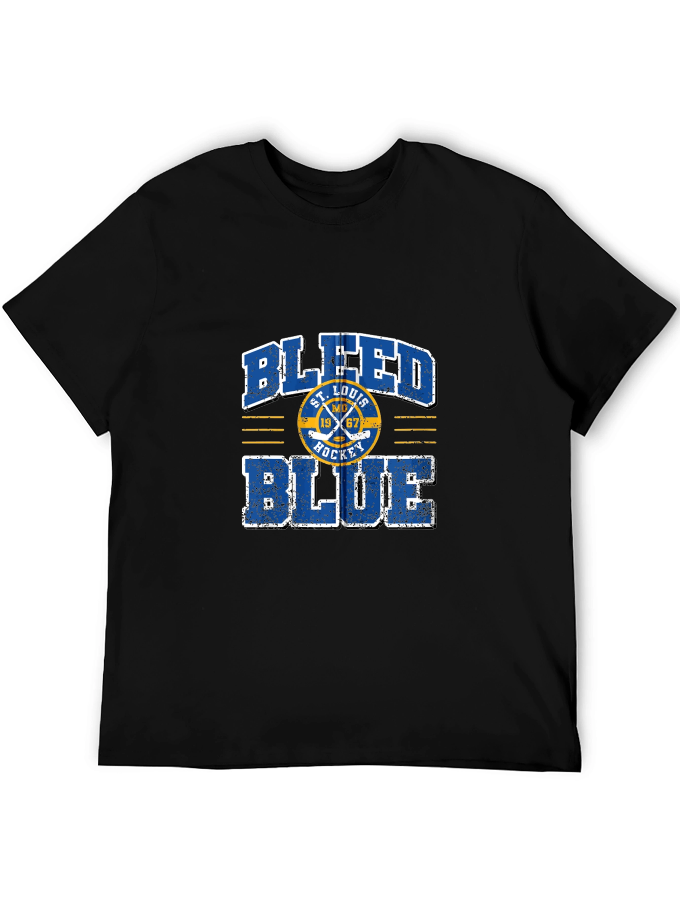 Show your team spirit with this vintage-style St. Louis Hockey t-shirt. The bold design features "BLEED BLUE" in a distressed collegiate font above and below the team's logo of crossed hockey sticks. The logo includes "ST. LOUIS," "1967," and "HOCKEY" in a circular design. It's perfect for game days, casual outings, or displaying your unwavering support. The black tee is made from a soft, comfortable fabric, ensuring a great fit and feel. Stand out from the crowd and let everyone know where your loyalty lies with this unique hockey tee.