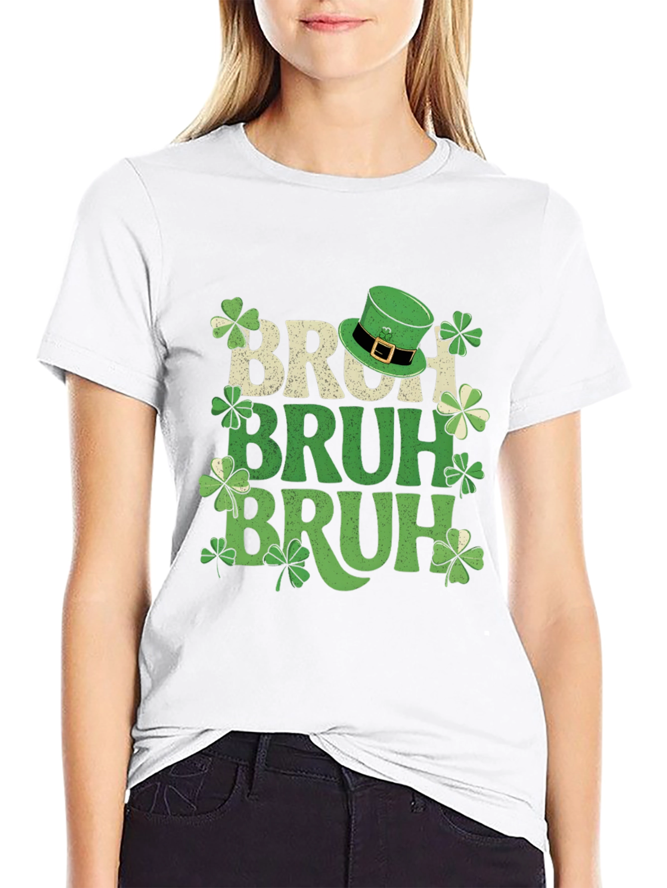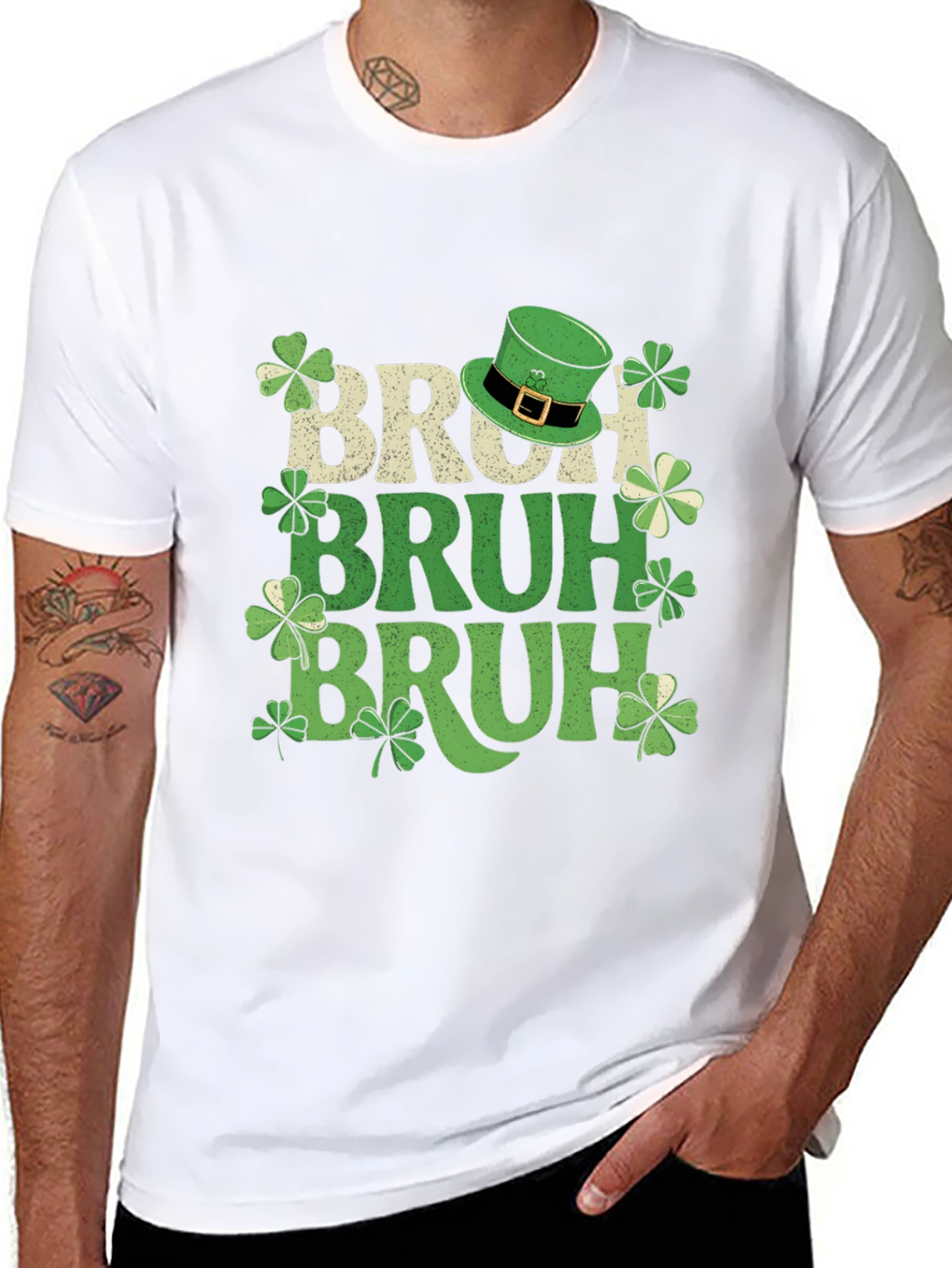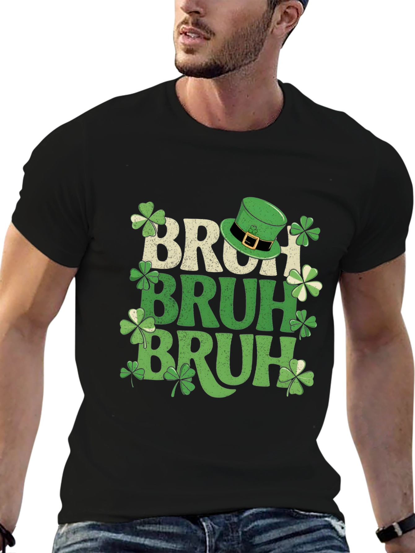 Celebrate St. Patrick's Day in style with this fun Bruh T-shirt. The shirt features the word "Bruh" stacked three times in different shades of green and tan, interspersed with lucky shamrocks and a leprechaun hat. This tee is perfect for St. Paddy's Day parties, parades, or casual wear. Show off your Irish spirit and sense of humor with this comfortable and festive shirt.