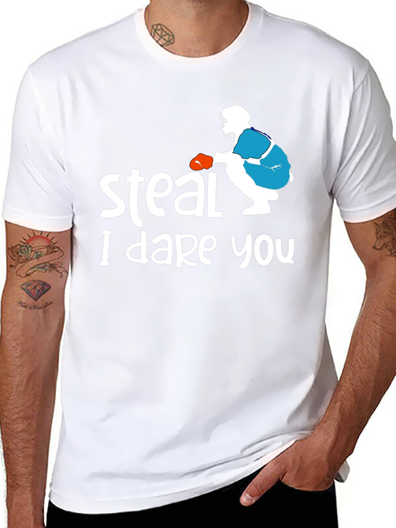 Show off your love for baseball with this unique graphic tee! The shirt features the phrase 'Steal I dare you' above a graphic of a baseball catcher. The playful design and bold text make it a fun statement piece. Made from comfortable material, this tee is great for casual outings, sports events, or simply lounging at home. Makes a fantastic gift for baseball fans and players! This t-shirt has a classic fit, is a solid black, and is made for every day wear.