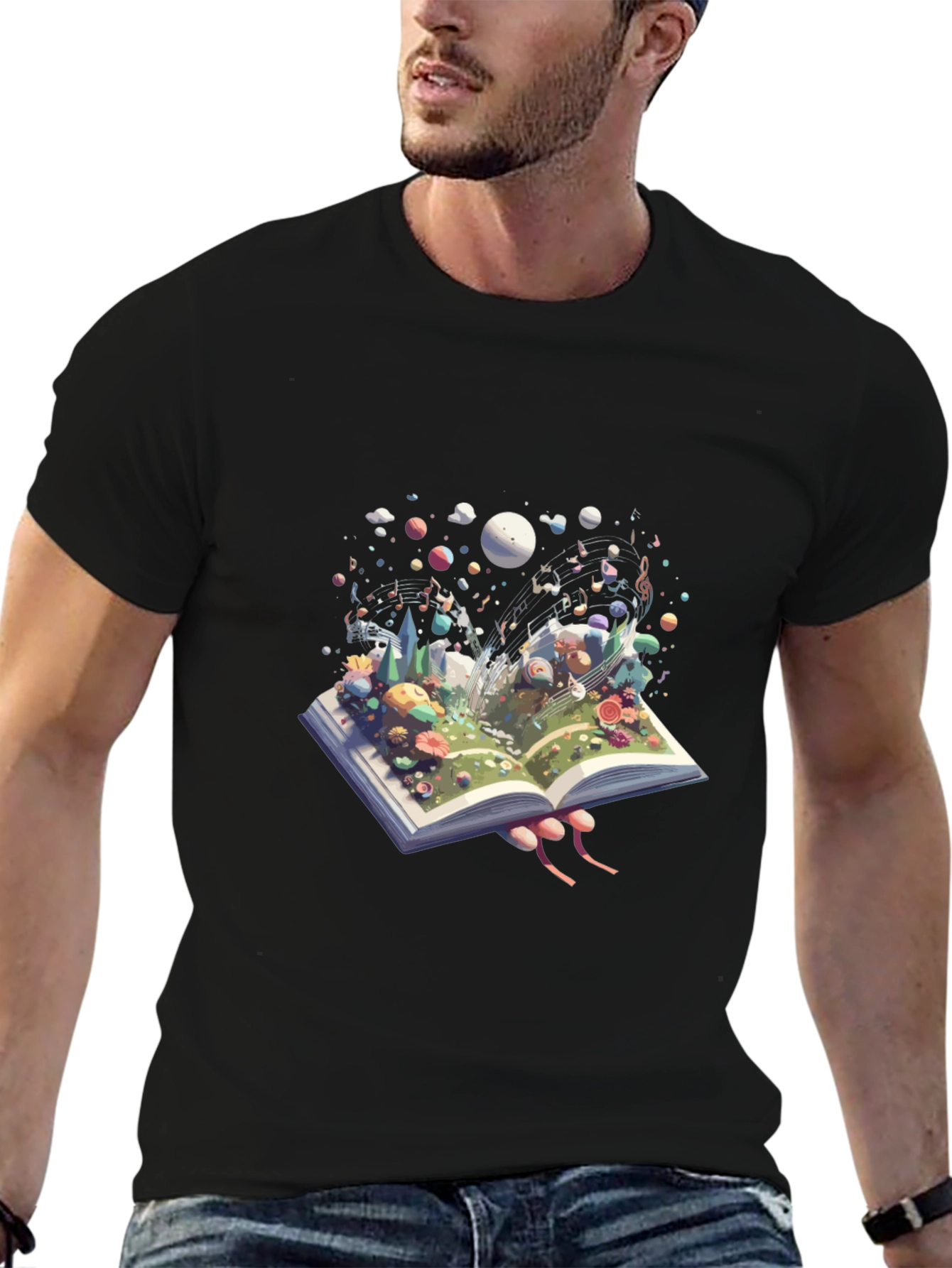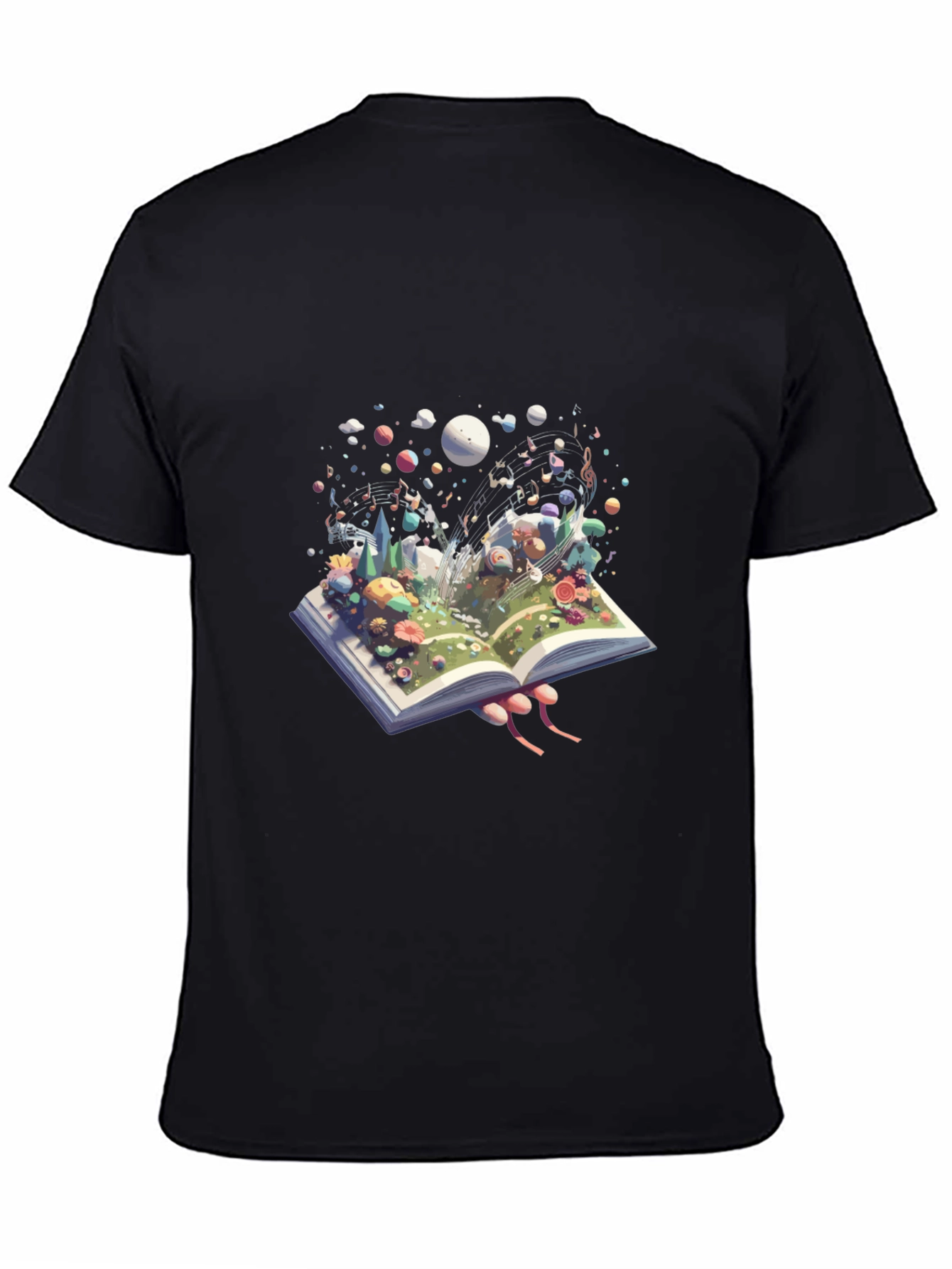 Unleash your imagination with this eye-catching t-shirt! Featuring a vibrant and whimsical design, an open book bursts to life with colorful flora and a fantasy landscape with musical notes dancing in the air. This unique artwork is perfect for book lovers, music enthusiasts, and anyone who appreciates creative expression. Made from soft, breathable fabric, it offers both comfort and style. Wear this eye-catching tee to spark conversations and showcase your unique personality. Ideal for casual outings, concerts, or simply lounging at home with a good book.