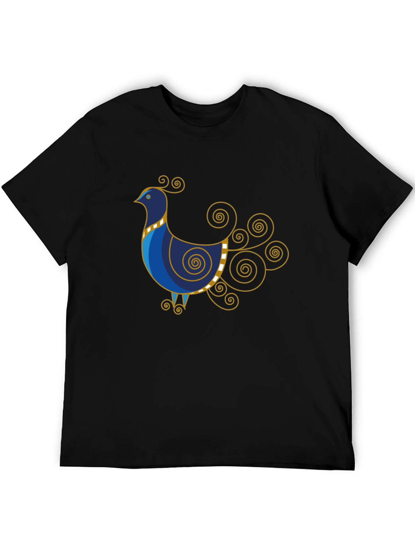 Show off your unique style with this eye-catching black t-shirt featuring a stylized bird graphic. The striking blue and yellow design adds a pop of color, while the intricate details and curled tail create a playful yet sophisticated look. Made from comfortable, breathable fabric, this tee is perfect for everyday wear or casual outings. Pair it with jeans or shorts for a relaxed, trendy vibe. A conversation starter that's sure to turn heads!