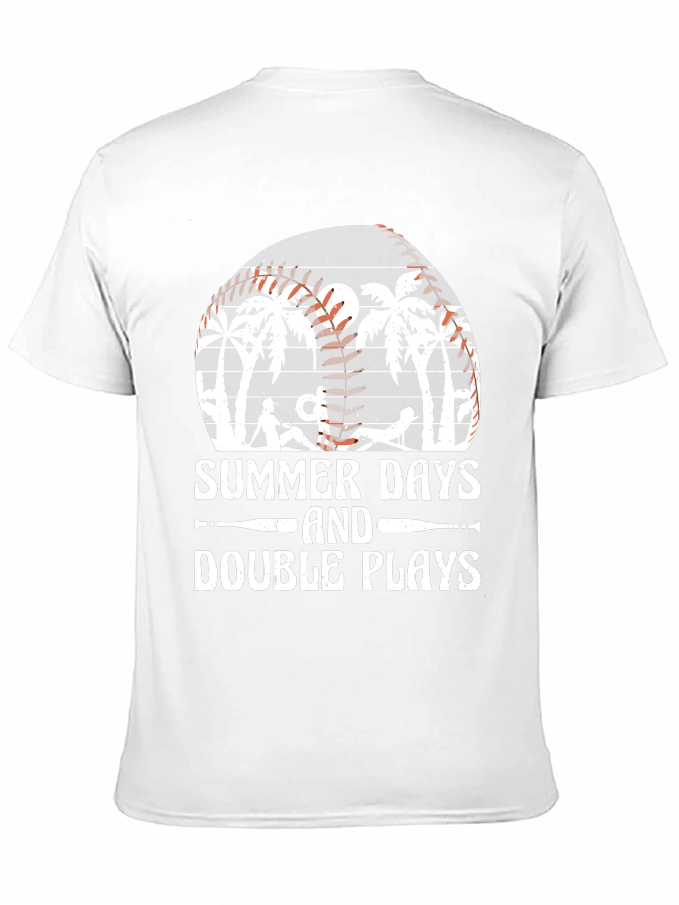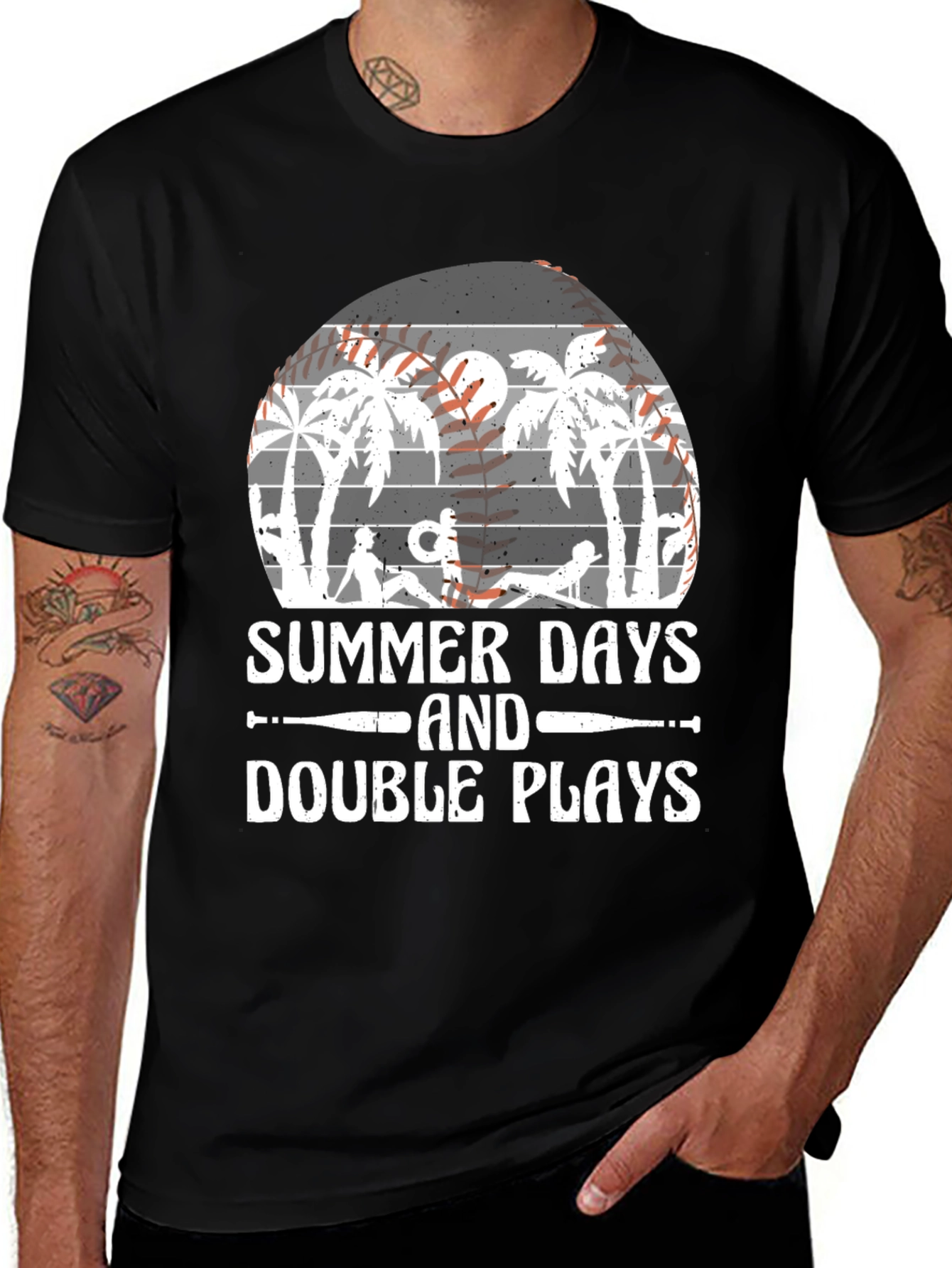 Embrace the carefree spirit of summer with this stylish black graphic tee. The shirt features a unique baseball-themed design showcasing palm trees, a sunset, and the phrase "Summer Days and Double Plays", perfect for baseball enthusiasts and beach lovers alike. The design also incorporates baseball stitching. Crafted from a comfortable fabric, this tee offers a relaxed fit ideal for casual wear. Whether you're heading to a game, lounging on the beach, or simply enjoying a sunny day, this shirt is a great addition to your wardrobe. Pair it with your favorite jeans or shorts for an effortlessly cool look. Get ready to hit a style home run!