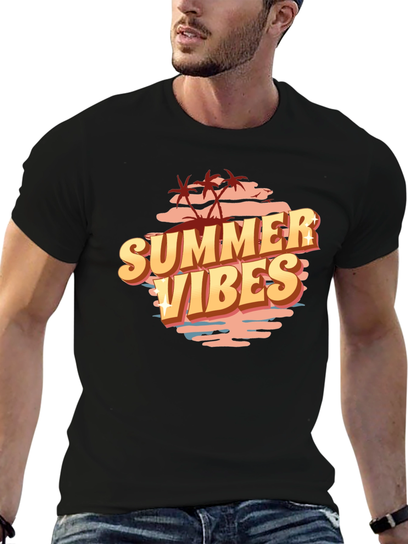 Get ready for summer with this stylish black t-shirt. It features a vibrant "Summer Vibes" graphic, complete with palm trees and a beachy sunset design. The bold, retro-inspired font adds a touch of nostalgia. Made from what appears to be a soft and comfortable cotton blend, this tee is perfect for casual wear, beach trips, or hanging out with friends. Show off your love for summer with this eye-catching and trendy t-shirt. A must-have for your warm-weather wardrobe!
